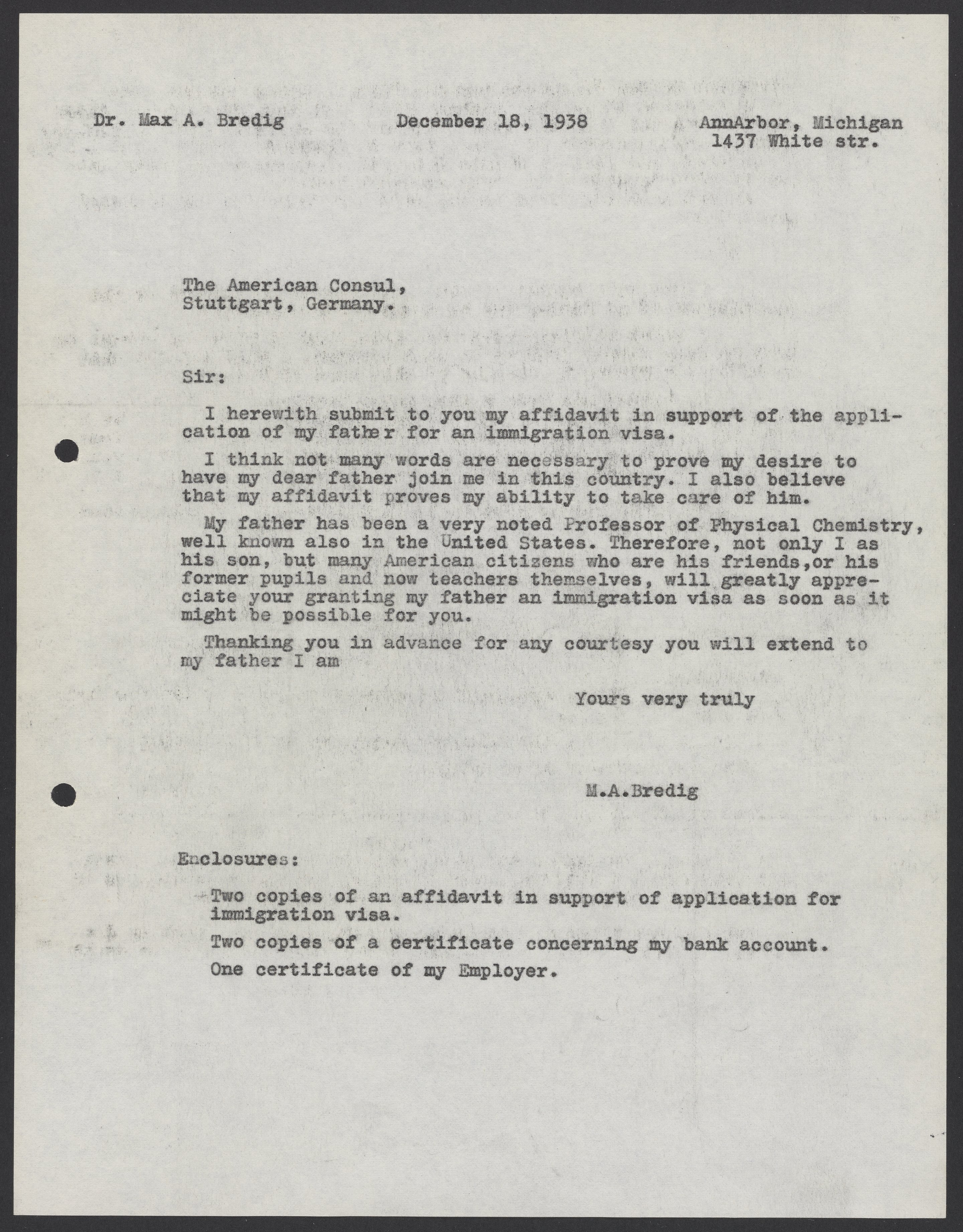 Letter from Max Bredig to the American consul, Stuttgart, December 18, 1938