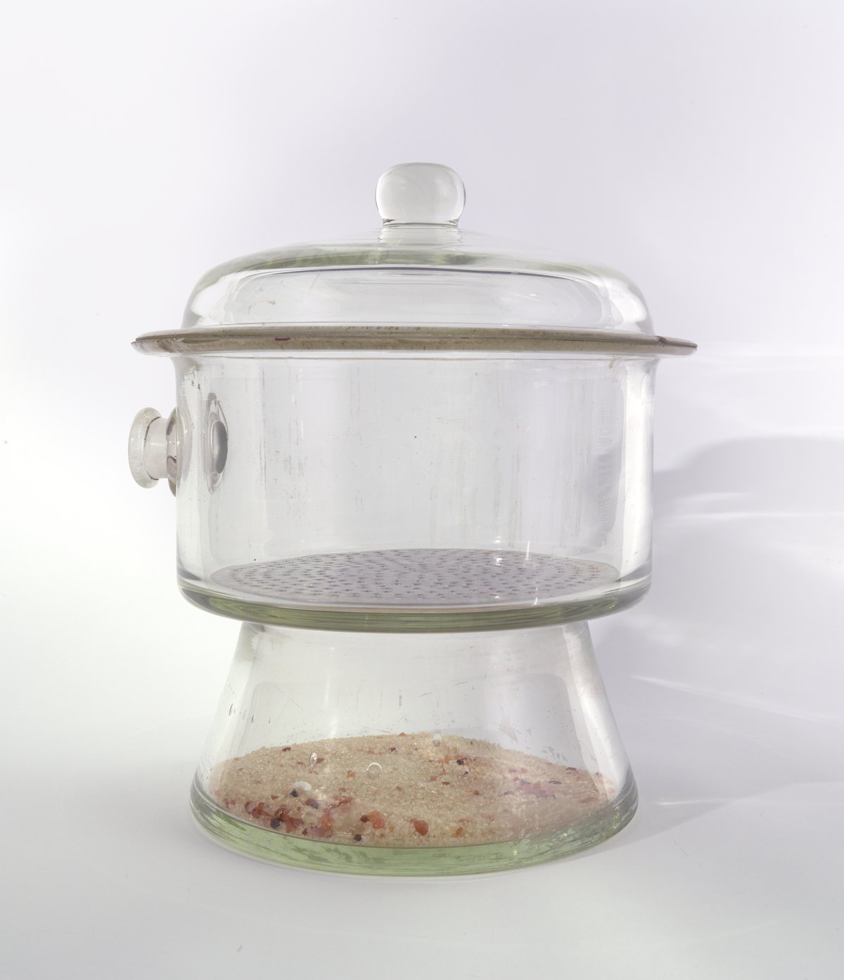 Small JPG1200 x 1383px — 86.6 KBLarge JPG2880 x 3320px — 351 KBFull-sized JPG6266 x 7224px — 1.5 MBOriginal fileTIFF — 6266 x 7224px — 18.2 MBGlass chamber for dehydrating samples over a desiccant chemical. Desiccant crystals remain in the bottom lobe of the device. A valve on the side of the upper lobe allows a vacuum to be attached. After being used by Rosalind Franklin (1920-1958) and Raymond Gosling (1926-2015) at King’s College London circa 1952, this desiccator remained in Gosling’s possession. The practice of drying and moistening samples played an important role in Franklin and Gosling’s research on the structure of DNA. They showed that the DNA molecule occurred in two distinct forms, A and B, depending on humidity. In Gosling’s 1954 PhD thesis, he described using a desiccator to dry DNA samples over the chemical phosphorus pentoxide.