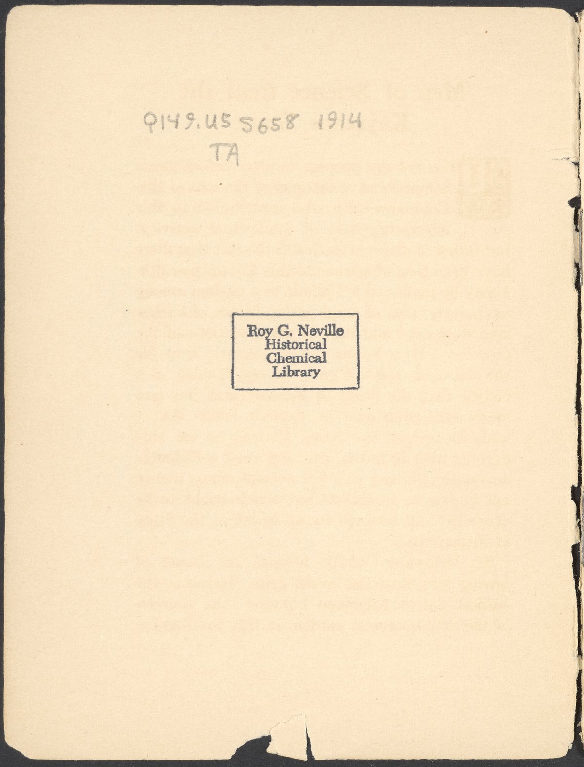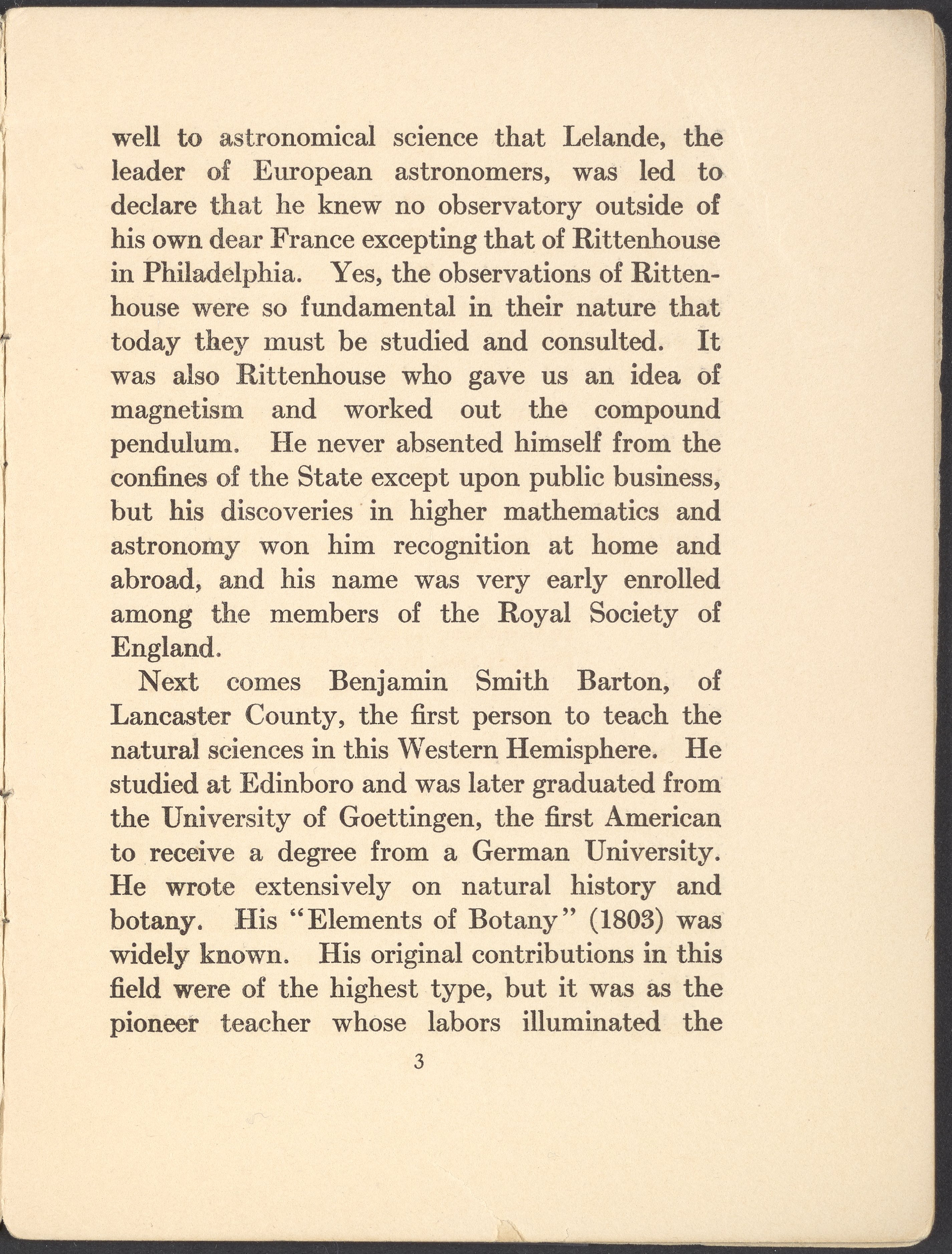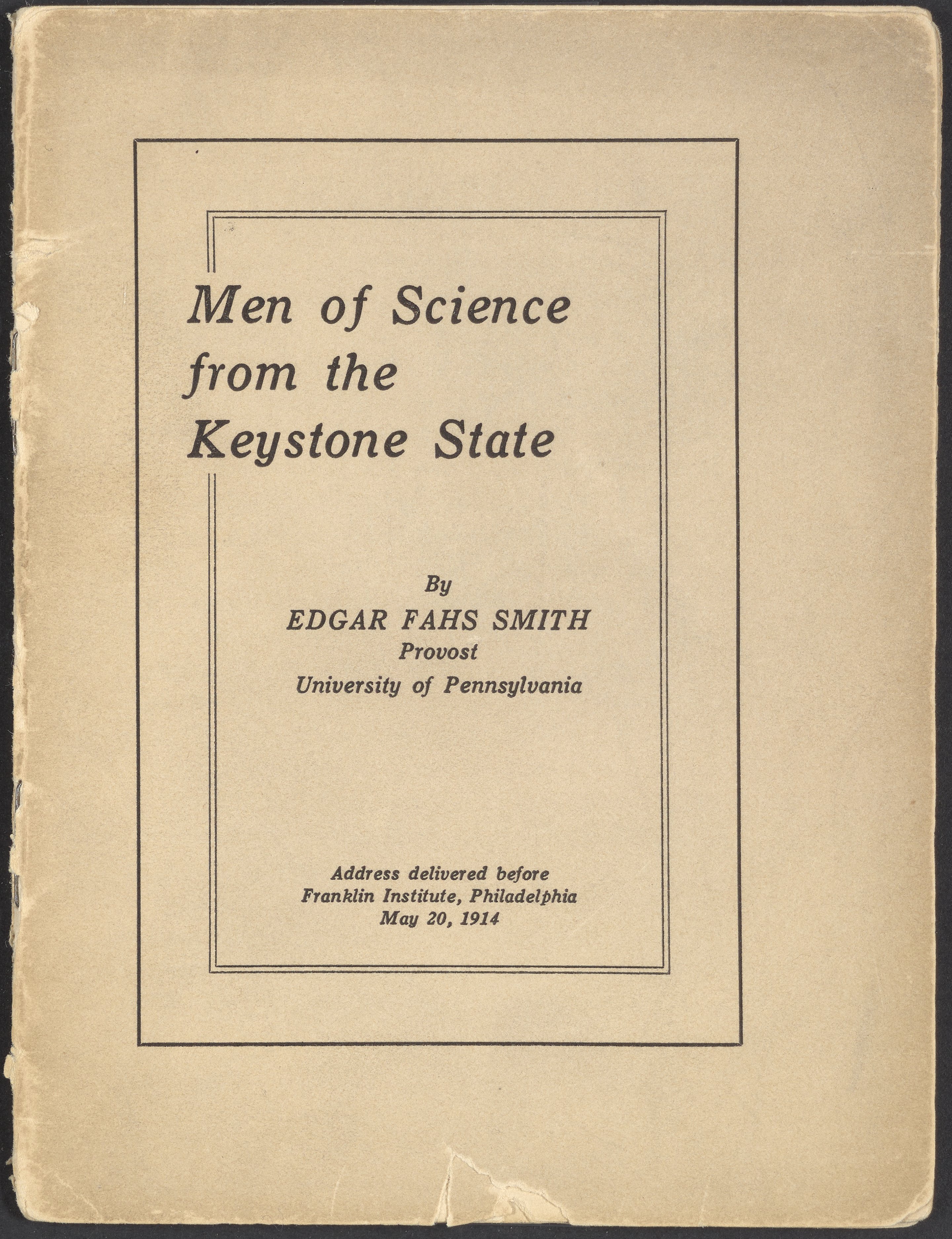 Smith, Edgar F. (Edgar Fahs). “Men of Science from the Keystone State: Address Delivered Before the Franklin Institute,” May 20, 1914. Q149.U5 S658 1914. Science History Institute. Philadelphia. https://digital.sciencehistory.org/works/quvsznx.