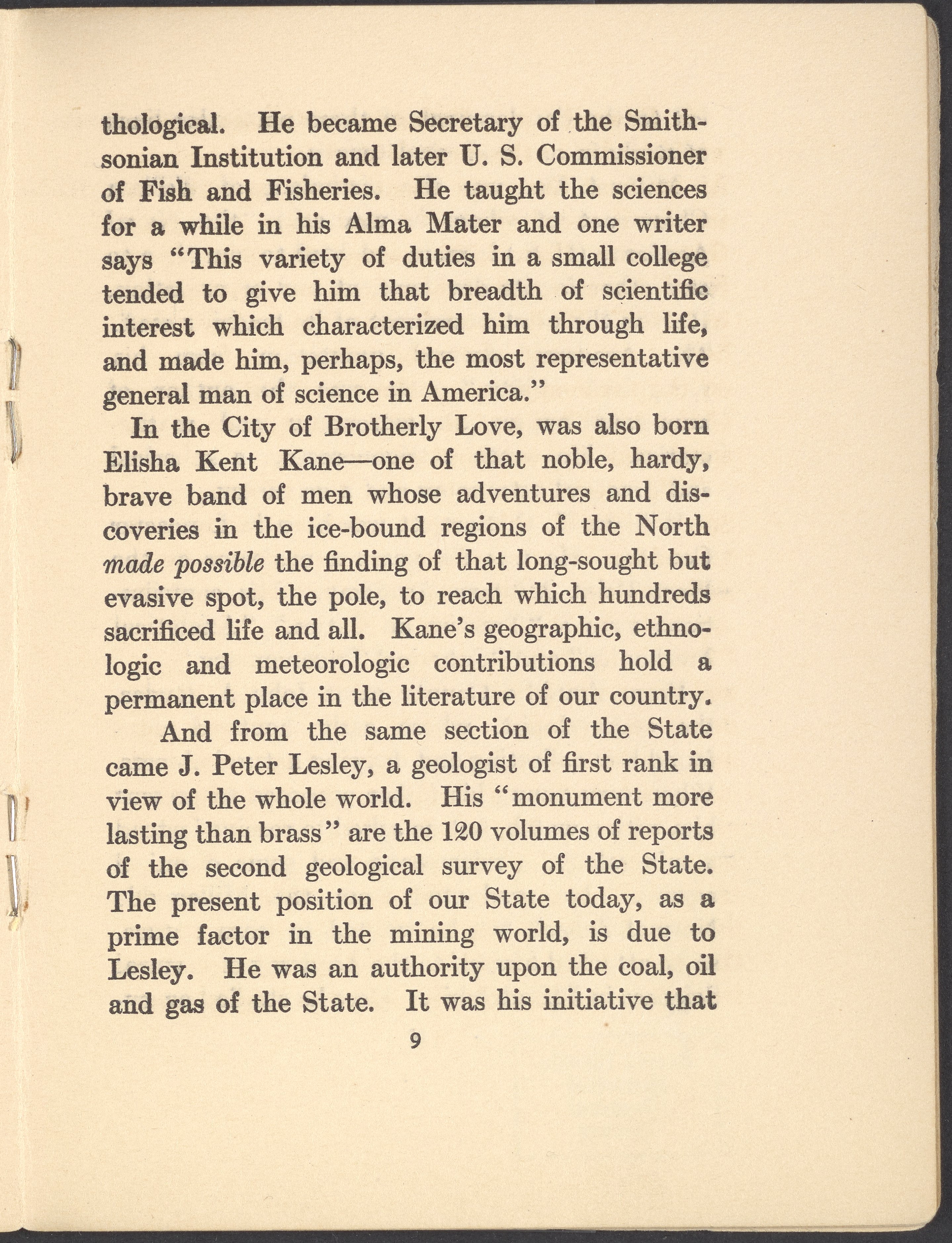 Small JPG1200 x 1562px — 341 KBLarge JPG2880 x 3748px — 1.9 MBFull-sized JPG2886 x 3756px — 1.9 MBOriginal fileTIFF — 2886 x 3756px — 31.0 MBEdgar Fahs Smith (1854-1928) was an American electrochemist known for his interest in the history of chemistry; he founded the American Chemical Society's Division for the History of Chemistry in 1922. Smith's résumé also included over 180 publications, leadership in several academic and professional organizations including as president of the American Chemical Society, and several honors for his work including the Priestly Medal in 1926. Smith was well-regarded as a public speaker. This speech was one of his many talks celebrating Pennsylvanian scientists such as John Bartram (1699-1777), David Rittenhouse (1732-1796), Benjamin Smith Barton (1766-1815), and Joseph Leidy (1823-1891).
