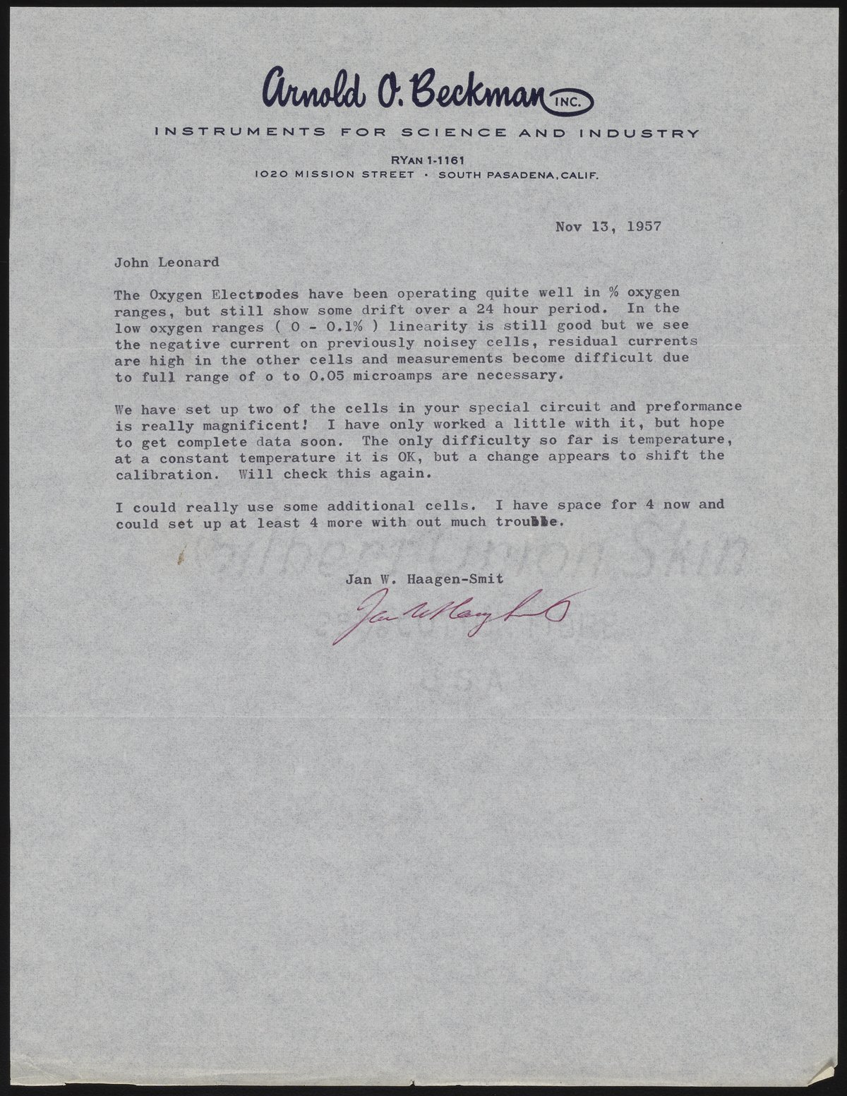 Letter from Jan W. Haagen-Smit (son of smog research pioneer Arie Haagen-Smit) about his work developing and testing a new oxygen electrode for Arnold O. Beckman, Inc.