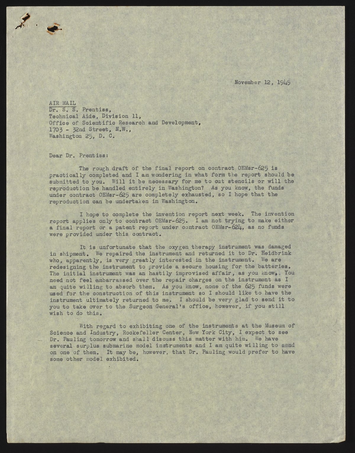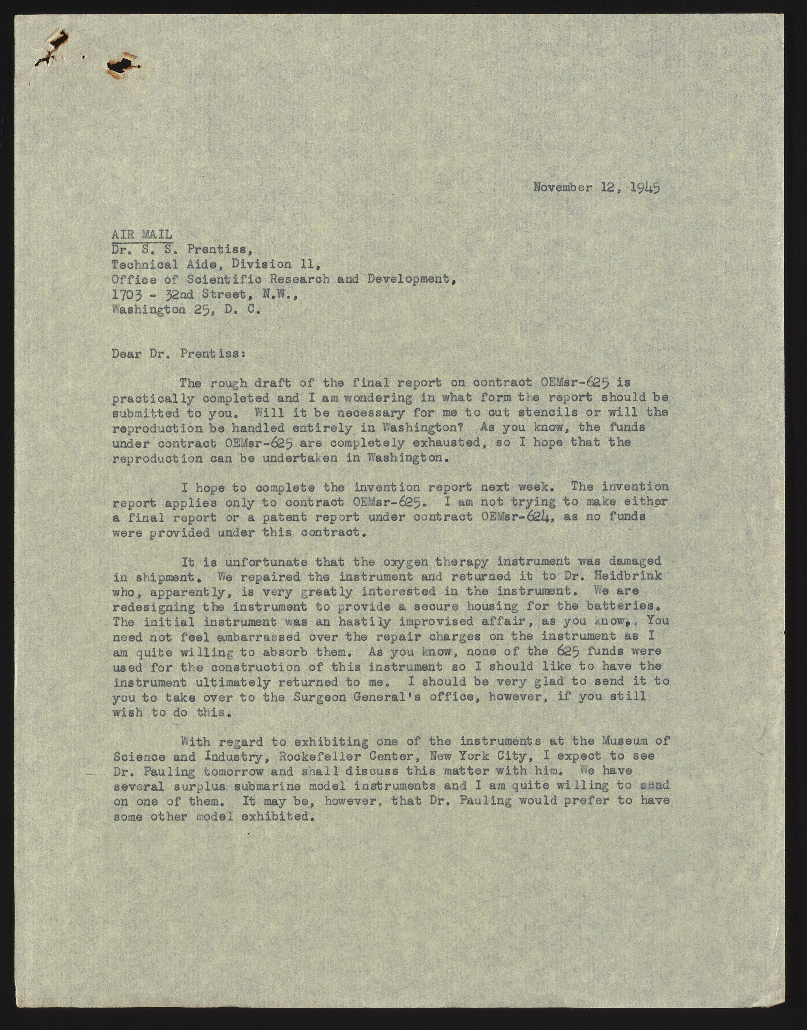 Arnold Beckman discusses the status of contract reports, an instrument damaged during shipment, and asks about Spencer Prentiss's post-war plans. He expects to consult with Linus Pauling to decide which instrument to exhibit at the Museum of Science and Industry.