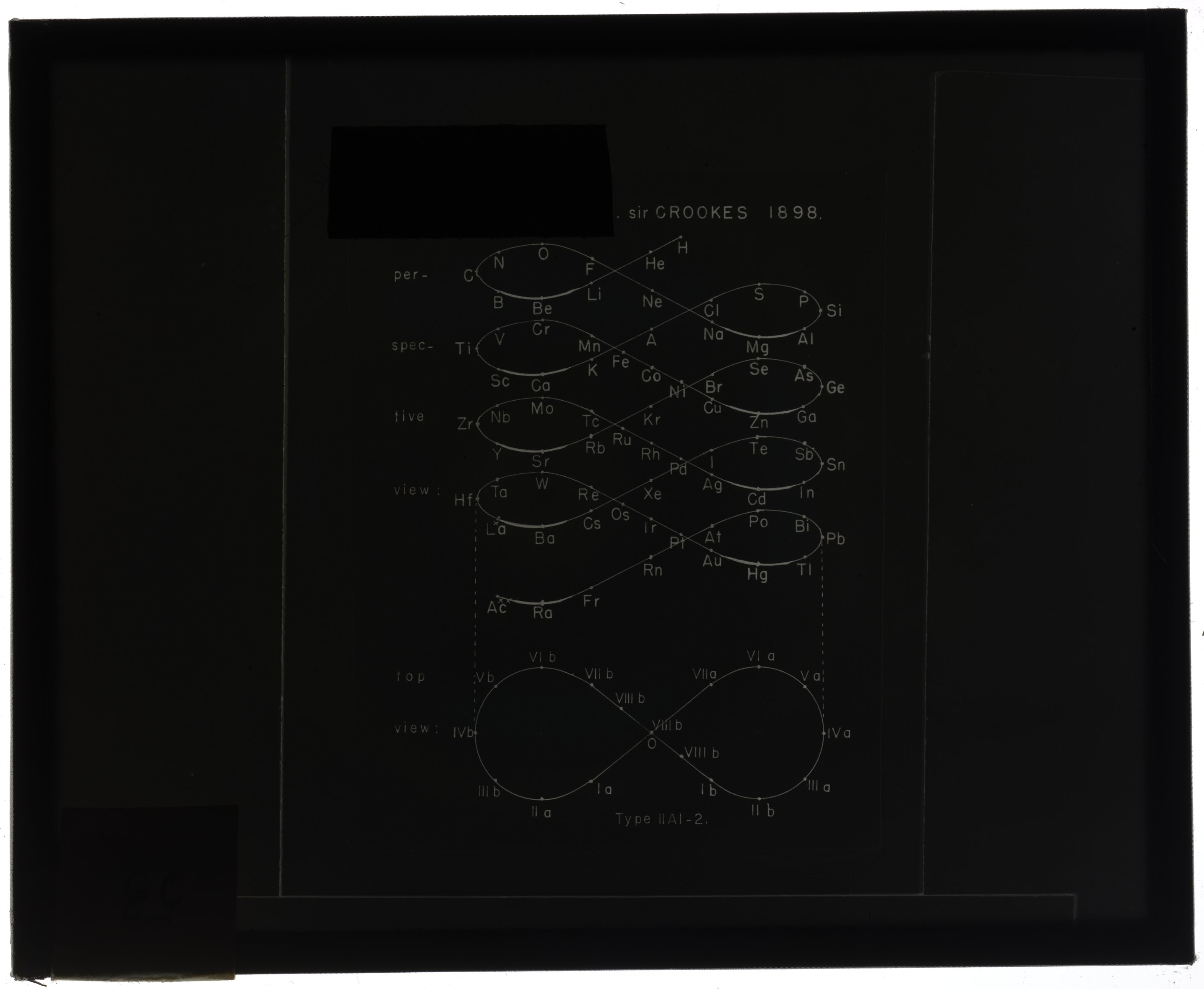 Top and perspective views of a graphic representation of the periodic table of chemical elements in the style of a space lemniscate. This table was originated by British chemist and physicist Sir William Crookes (1832-1919) in 1898 and and classified by Mazurs as Type IIA1-2 in his seminal work Types of Graphic Representation of the Periodic System of Chemical Elements (1957). This illustration appears as Figure 43 on page 119 of Mazurs' 1957 publication.
