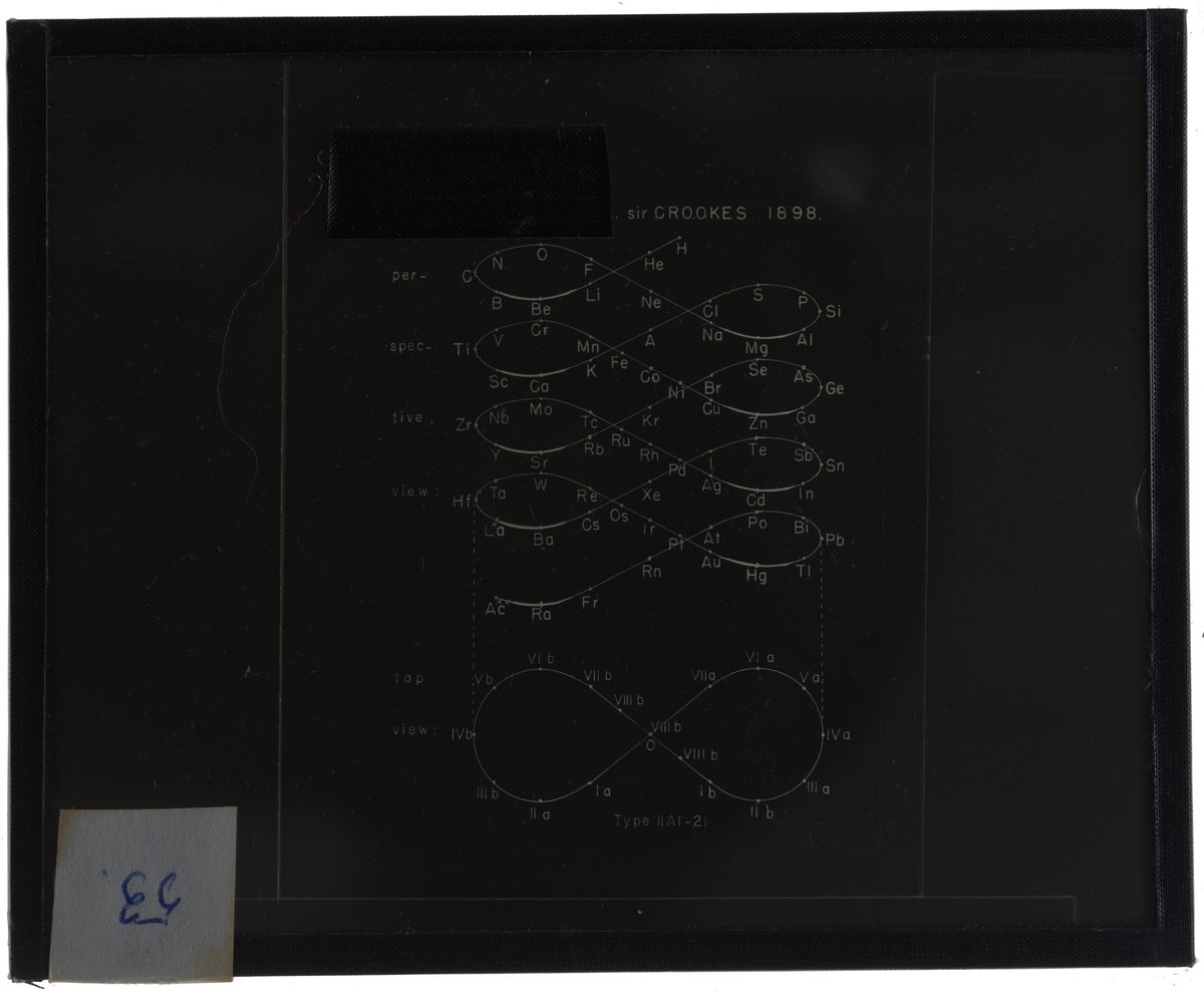 Crookes, William, and Edward G. Mazurs. “Periodic Table in the Style of a Space Lemniscate.” Glass (material), circa 1898–1957. Edward G. Mazurs Collection of Periodic Systems Images, Box 2. Science History Institute. Philadelphia. https://digital.sciencehistory.org/works/qv33rx287.