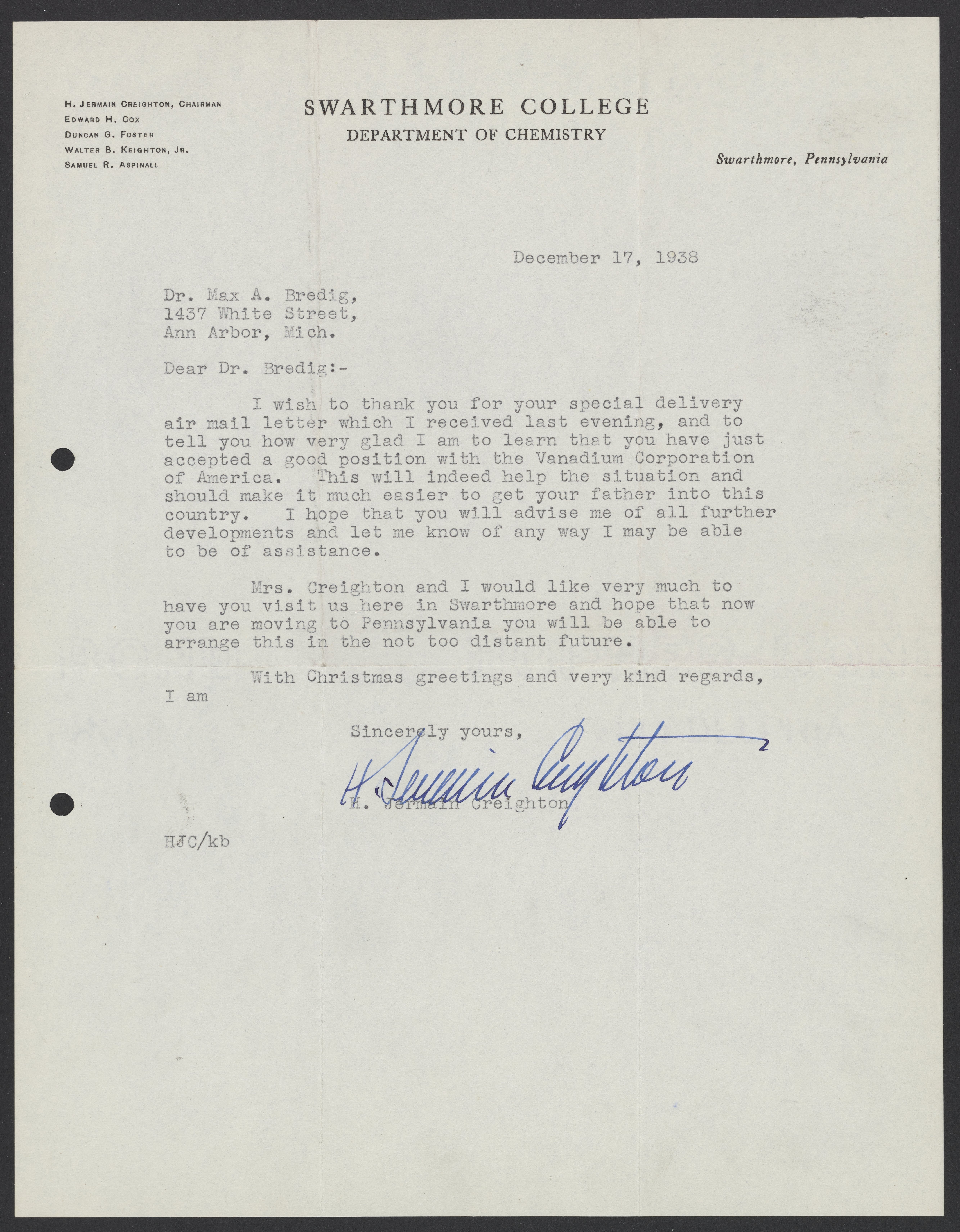Creighton, H. Jermain. “Letter from H. Jermain Creighton to Max Bredig, December 17, 1938,” December 17, 1938. Papers of Georg and Max Bredig, Box 7, Folder 36. Science History Institute. Philadelphia. https://digital.sciencehistory.org/works/qxg8neu.