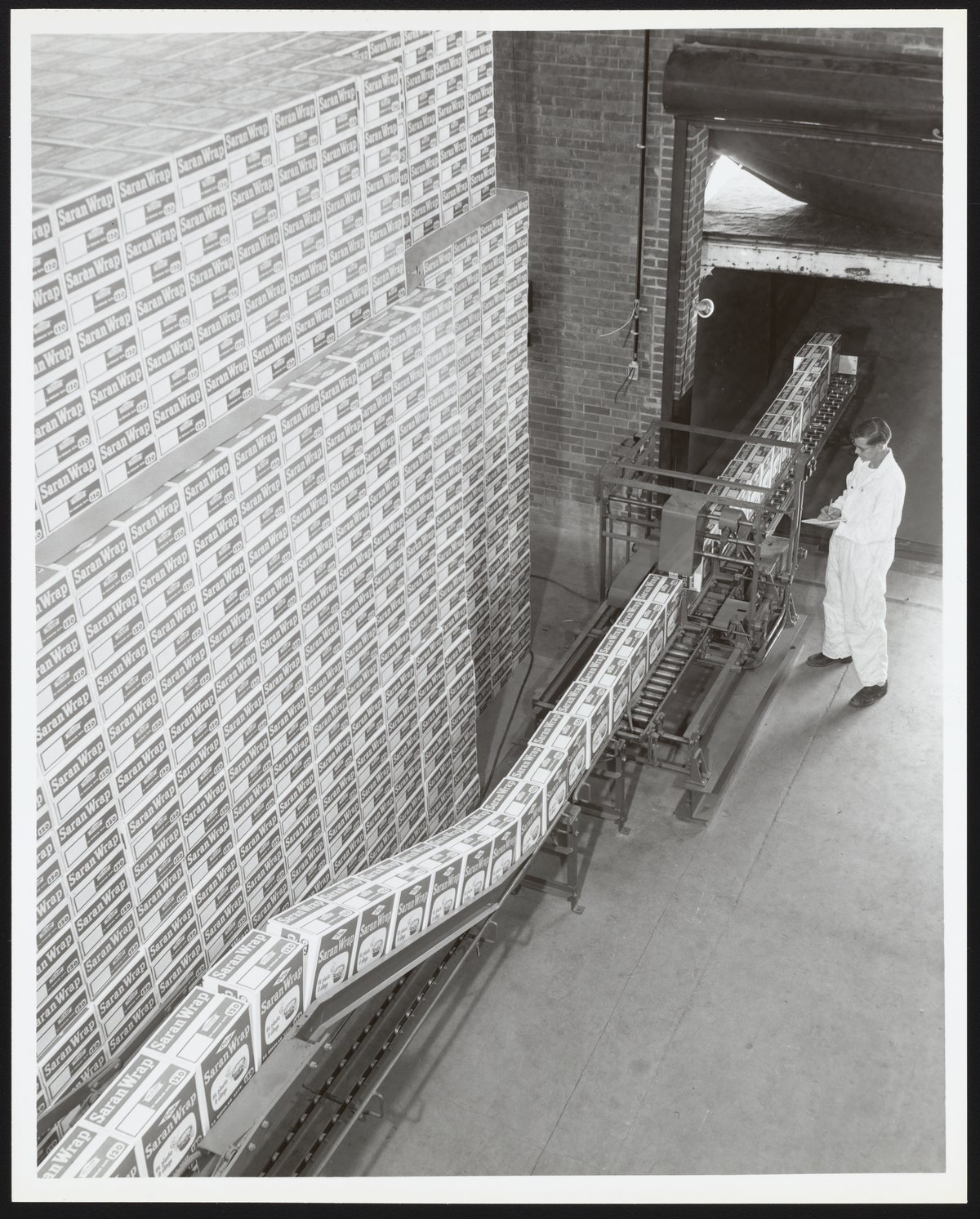 Elevated view of a conveyor belt transporting boxes of Saran Wrap at a Dow Chemical Company manufacturing facility in Midland, Michigan. Initially developed for the U.S. Army to wrap arms and equipment for transport during World War II, saran plastic was subsequently developed and marketed as Saran Wrap for household use. The employee visible in the photograph is unidentified.