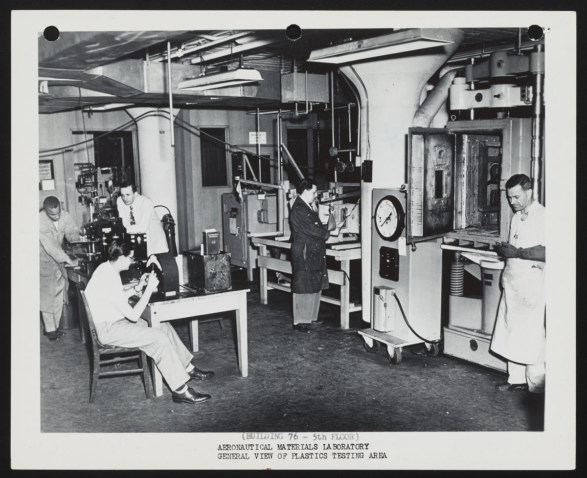 General view of the Plastics Testing area at the Naval Air Material Center's Aeronautical Materials Laboratory. Technicians are seen working with assorted equipment used to simulate various service conditions and test the effects on plastics, polymers, and other materials used in the production of naval aircraft.
