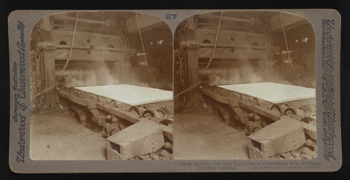 “Rolling Slab into Thin Plate in Homestead Mill, 4th Stage in Plate Making.” Underwood & Underwood, n.d. Underwood & Underwood Stereographs of Manufacturing Industries. Science History Institute. Philadelphia. https://digital.sciencehistory.org/works/r494vk18s.