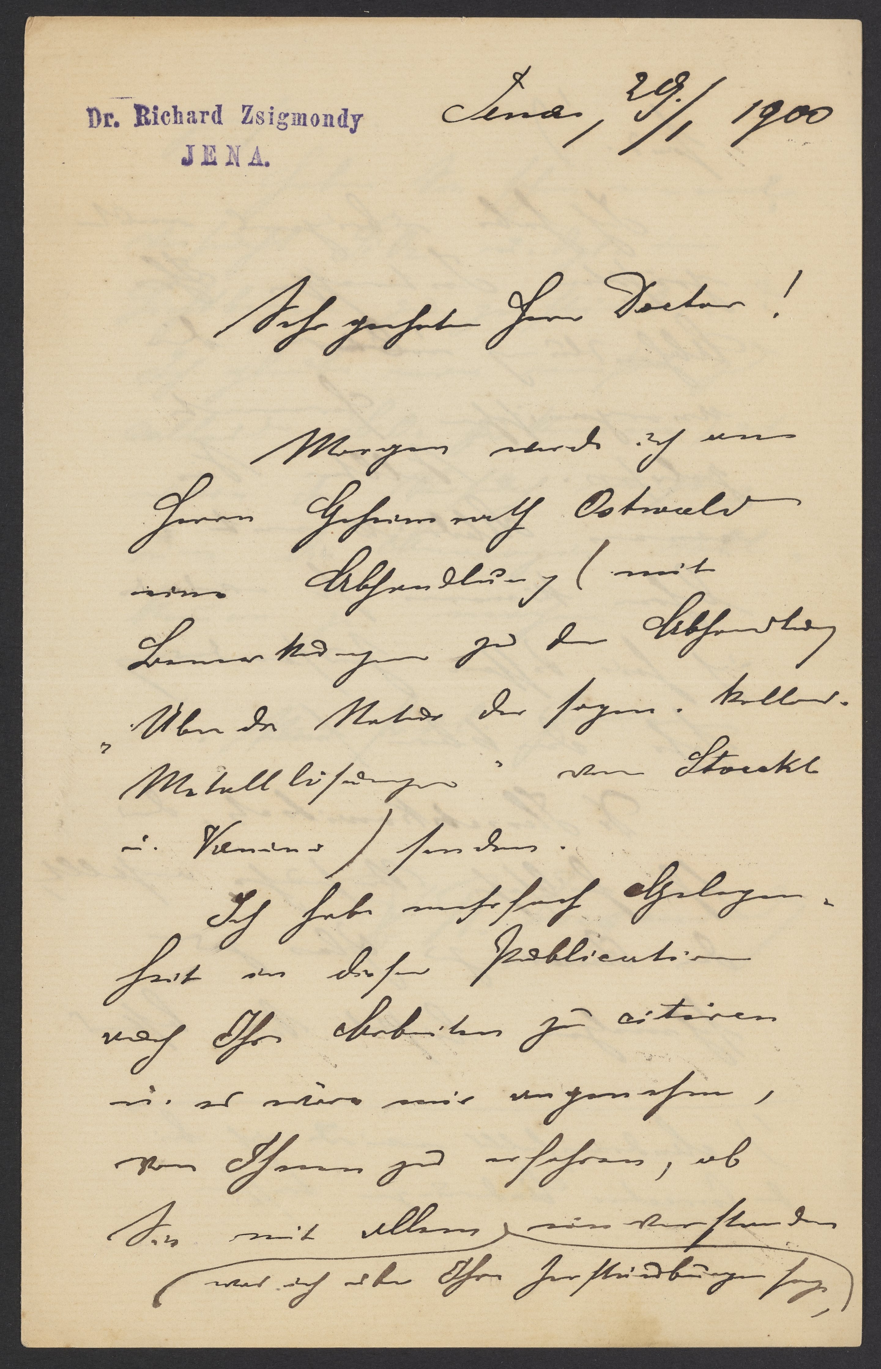 Morgen werde ich an Herrn Geheimrath Ostwald eine Abhandlung (mit Bemerkungen zu der Abhandlung „Über die Natur der sogenannten kolloidalen Metalllösungen“ von Stoeckl u. Vanino) senden.
