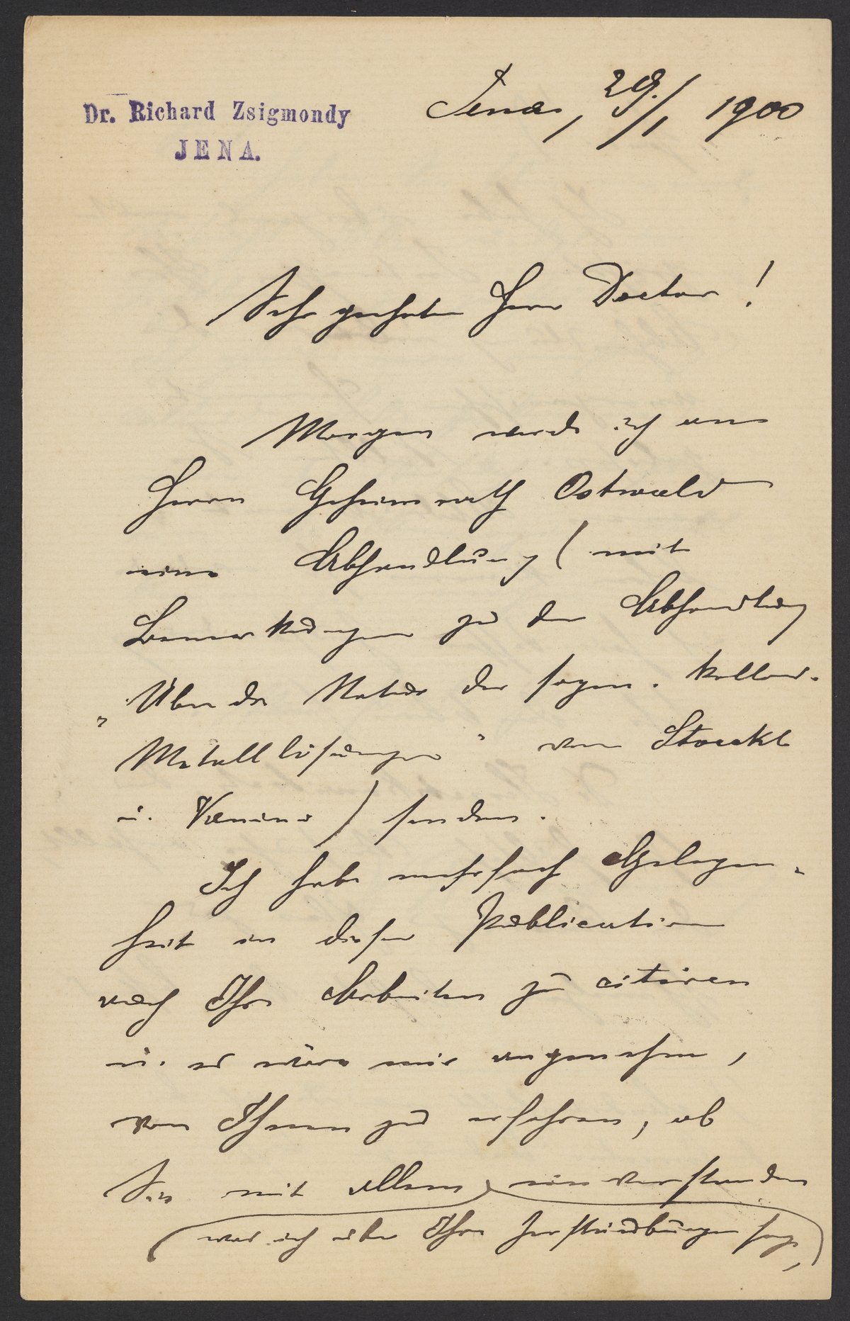Zsigmondy, Richard Adolf. “Letter from Richard Adolf Zsigmondy to Georg Bredig, January 1900,” January 29, 1900. Papers of Georg and Max Bredig, Box 2, Folder 72. Science History Institute. Philadelphia. https://digital.sciencehistory.org/works/r58cnts.