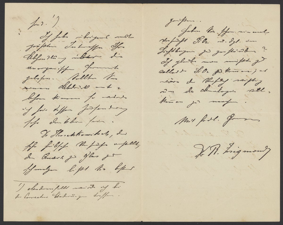 Small JPG1200 x 1864px — 326 KBLarge JPG2880 x 4474px — 1.7 MBFull-sized JPG3533 x 5488px — 2.5 MBOriginal fileTIFF — 3533 x 5488px — 55.5 MBRichard Adolf Zsigmondy (1865-1929), an Austrian colloidal chemist who won the Nobel Prize for Chemistry in 1925, tells Georg Bredig (1868-1944) that he would like to cite his work in an upcoming publication. Zsigmondy additionally compliments Bredig on his work with inorganic ferments.