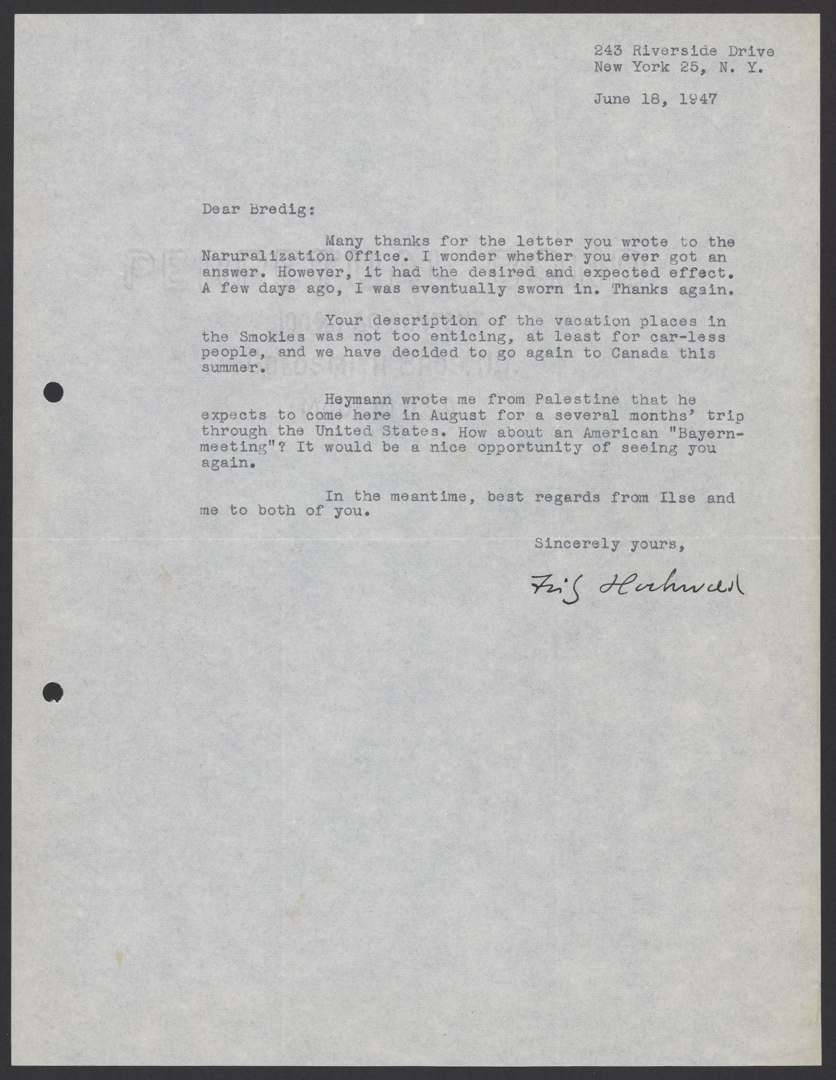 Fritz Hochwald (1897-1969) thanks Max Bredig (1902-1977) for writing a letter to the Naturalization Office.
