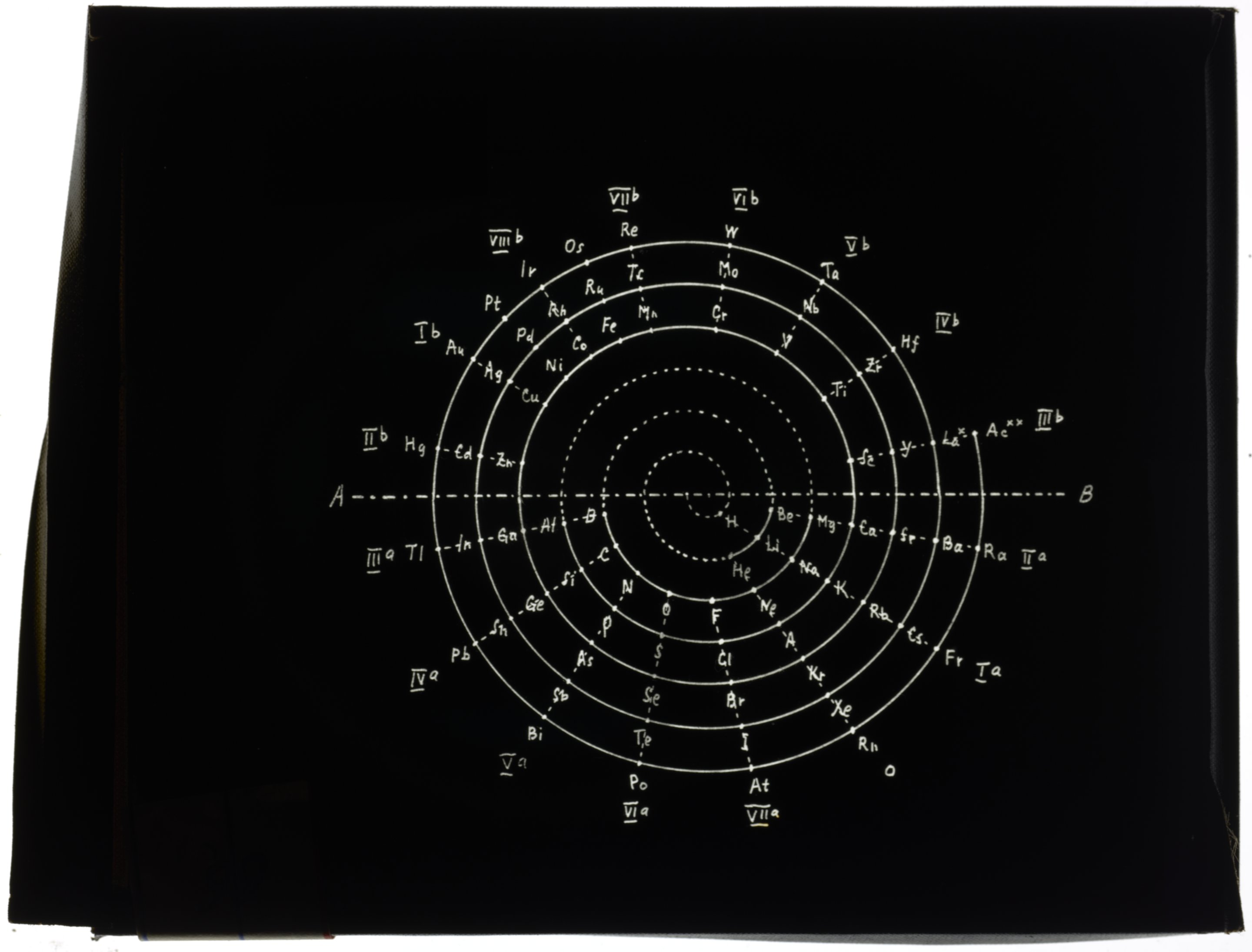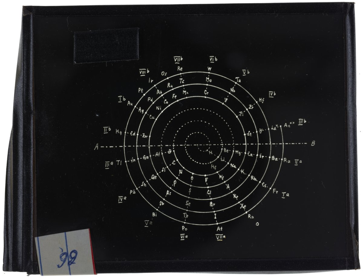Periodic table in the style of spiral with radii (Heinrich Adolph Baumhauer, 1870)1870 (Original design), Circa 1957 (Date attributed to slide)