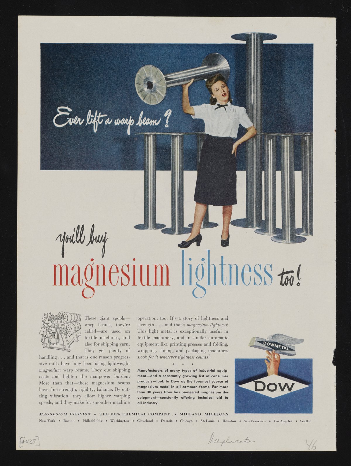 Dow Chemical Company. “Ever Lift a Warp Beam?,” circa 1946. Advertisements from the Dow Chemical Historical Collection, Box 8. Science History Institute. Philadelphia. https://digital.sciencehistory.org/works/rax5okn.