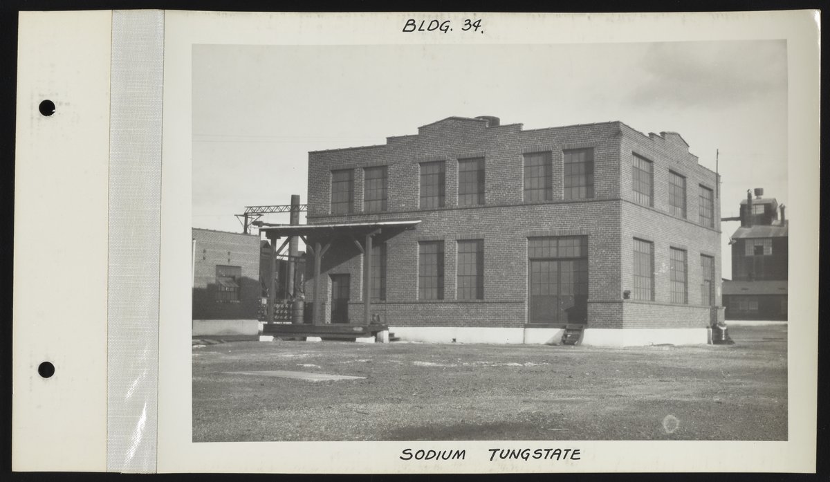 Rohm and Haas Company. “Sodium Tungstate Manufacturing Facility.” Exterior Views of Charles Lennig and Company Plant in Bridesburg, 1931. Rohm & Haas Company Archives, Box 27 (Photographs), Folder 8. Science History Institute. Philadelphia. https://digital.sciencehistory.org/works/rb68xc933.