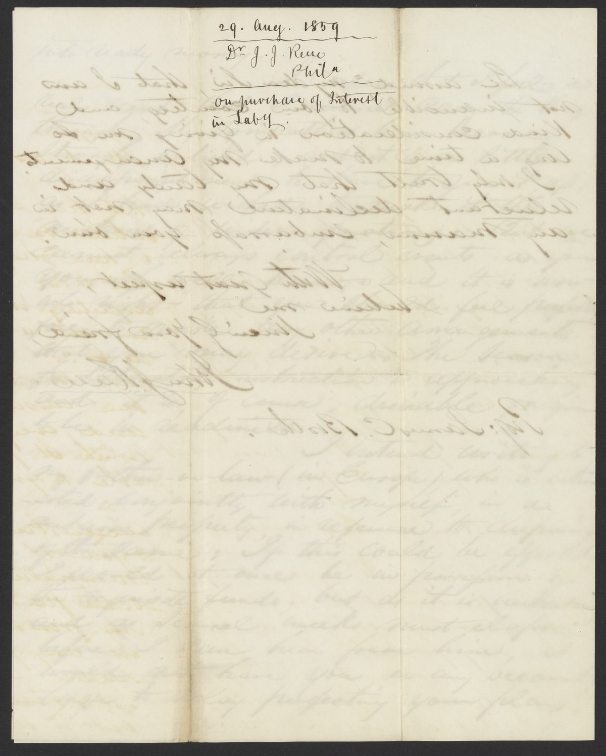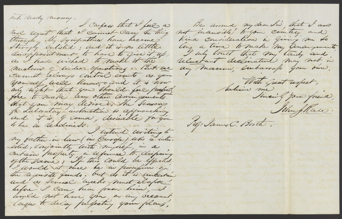 Small JPG1200 x 1504px — 342 KBLarge JPG2880 x 3610px — 1.2 MBFull-sized JPG3233 x 4052px — 1.4 MBOriginal fileTIFF — 3233 x 4052px — 37.5 MBDr. John James Reese (1818-1892), a professor of medical jurisprudence and toxicology at the University of Pennsylvania, writes to propose a purchase of a share in James Curtis Booth's (1810-1888) laboratory.