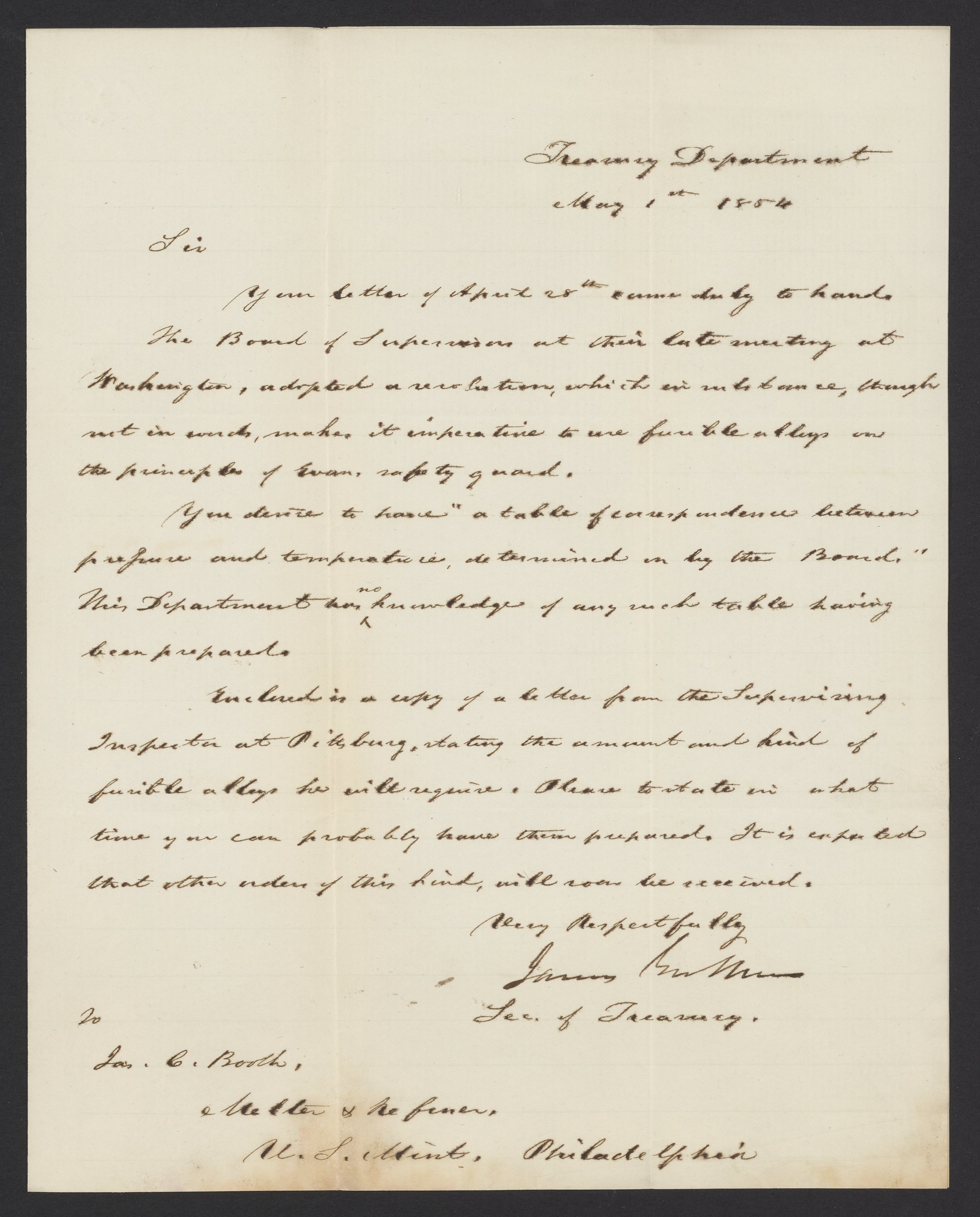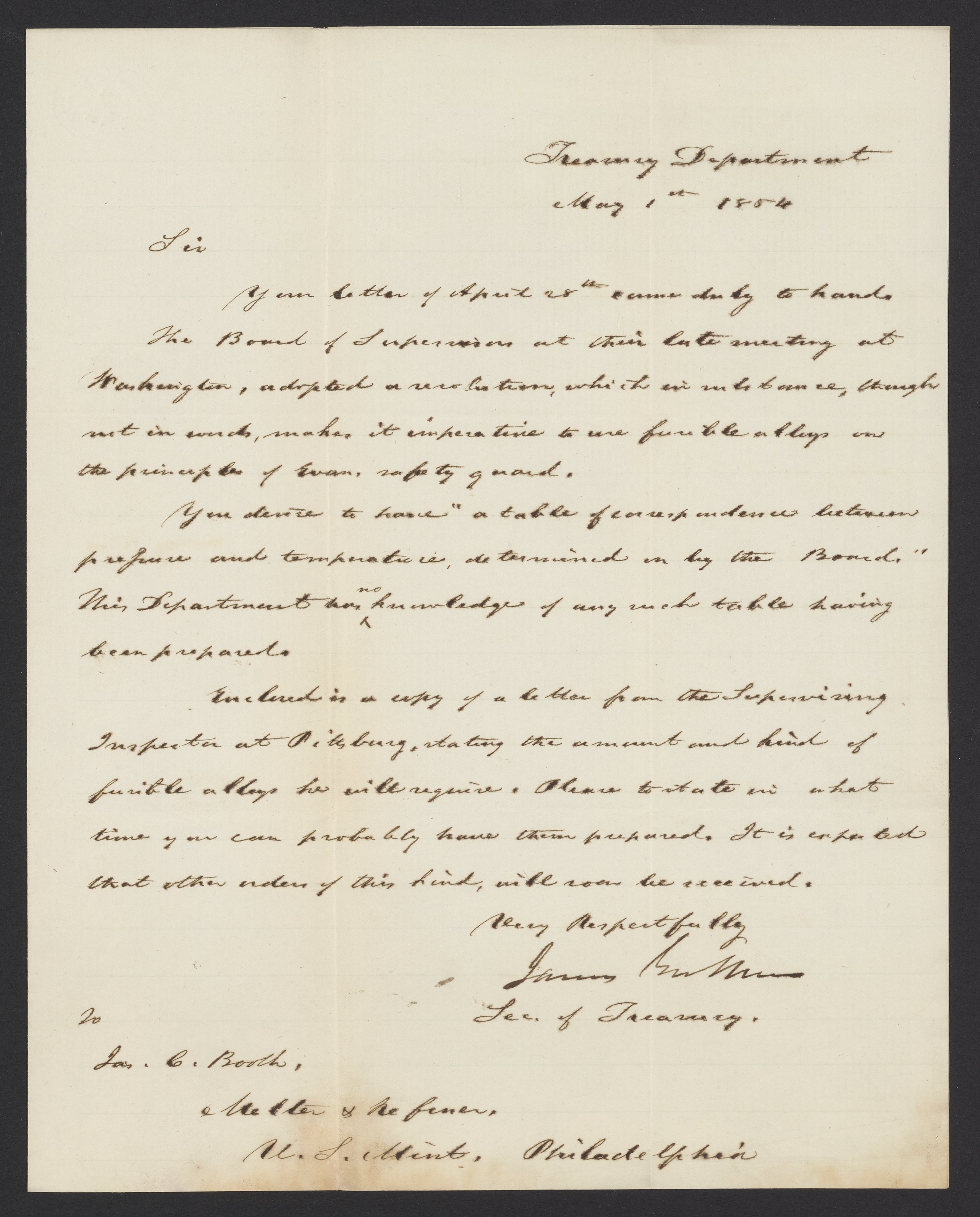 Small JPG1200 x 1490px — 195 KBLarge JPG2880 x 3576px — 1014 KBFull-sized JPG3335 x 4141px — 1.3 MBOriginal fileTIFF — 3335 x 4141px — 39.6 MBJames B. Guthrie (1792 - 1869), United States Secretary of the Treasury from 1853-1857, responds to James Curtis Booth (1810-1888) informing him that Booth's request for "a table of correspondences between pressure and temperature, determined by the Board [of Supervisors]" can not be fulfilled, as none exists.