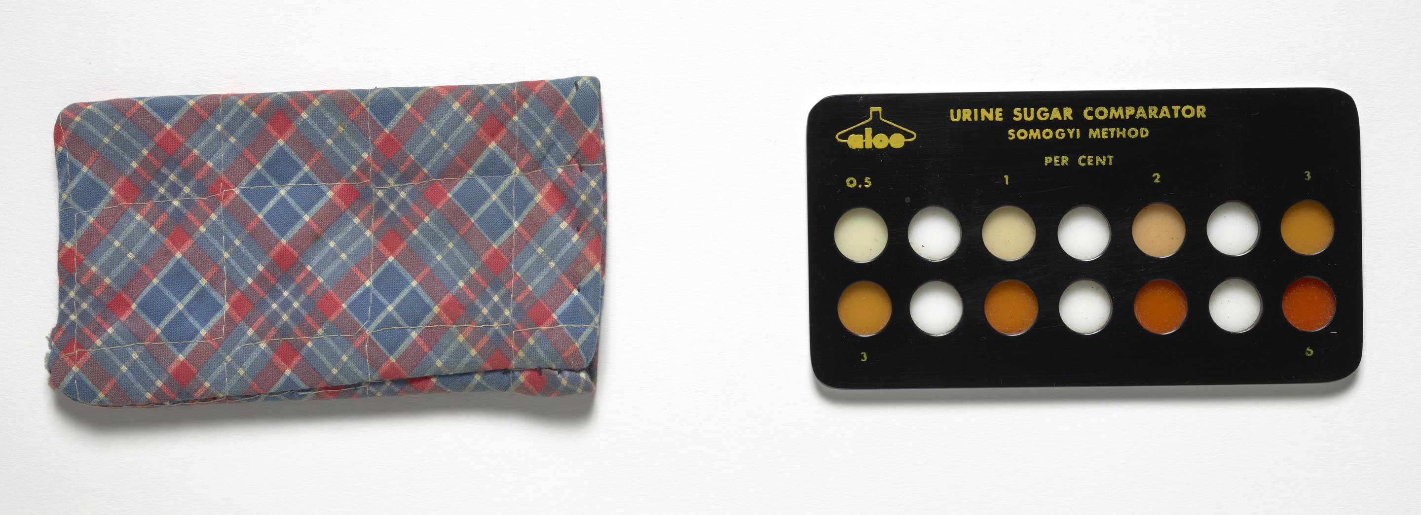 Small JPG1200 x 756px — 116 KBLarge JPG2880 x 1815px — 603 KBFull-sized JPG3946 x 2487px — 1.0 MBOriginal fileTIFF — 3946 x 2487px — 28.1 MBThis plastic comparator for the Somogyi Method Urine sugar test likely belonged to Dr. Michael Somogyi (1883-1971). Contains yellow printing with a fabric case. This screening device is used to determine glucose levels in urine, which may be an indicator of diabetes.