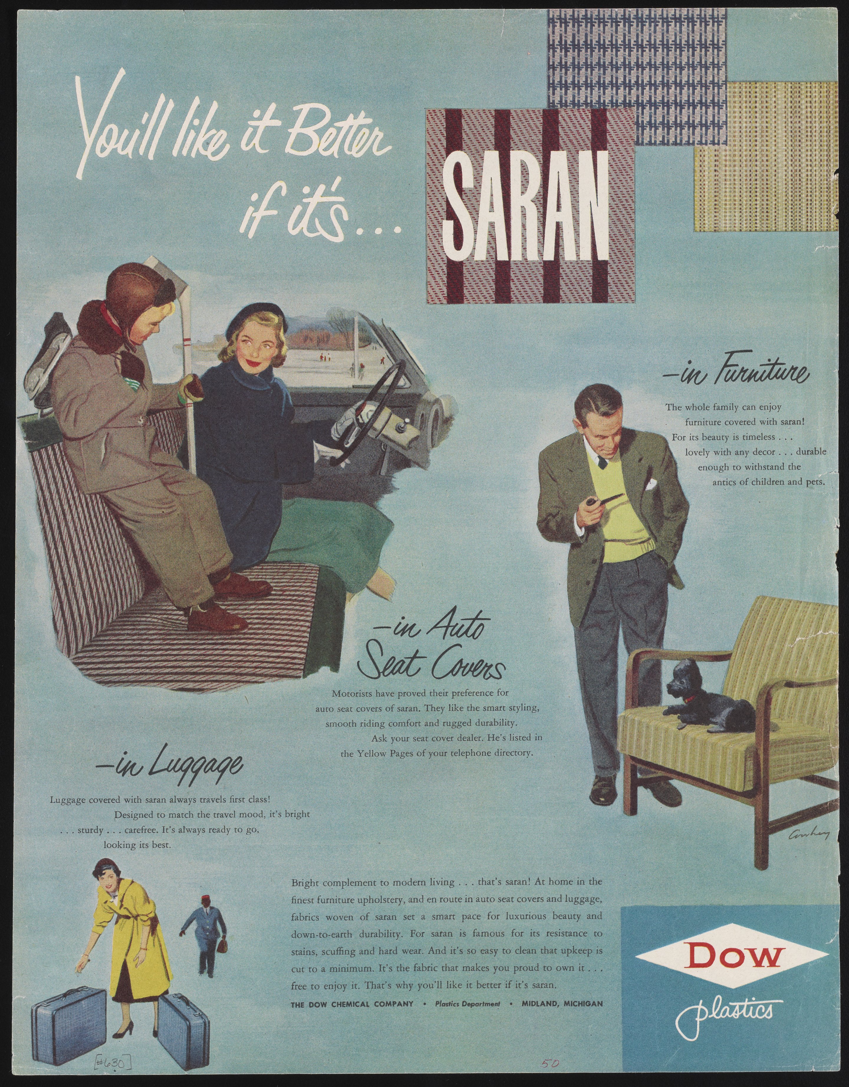 Color print advertisement for Saran fabric, made from Saran textile monofilaments. Saran is the trade name for polyvinylidene chloride, which can be formed into monofilaments or a thin plastic film. The advertisement features illustrated scenes showing the different uses of Saran, including a woman in a car with a young boy dressed for hockey, a man looking at a dog sitting on an upholstered chair, and a woman picking up a set of suitcases. The accompanying text describes different uses of Saran fibers in upholstery, fabrics and other consumer goods.