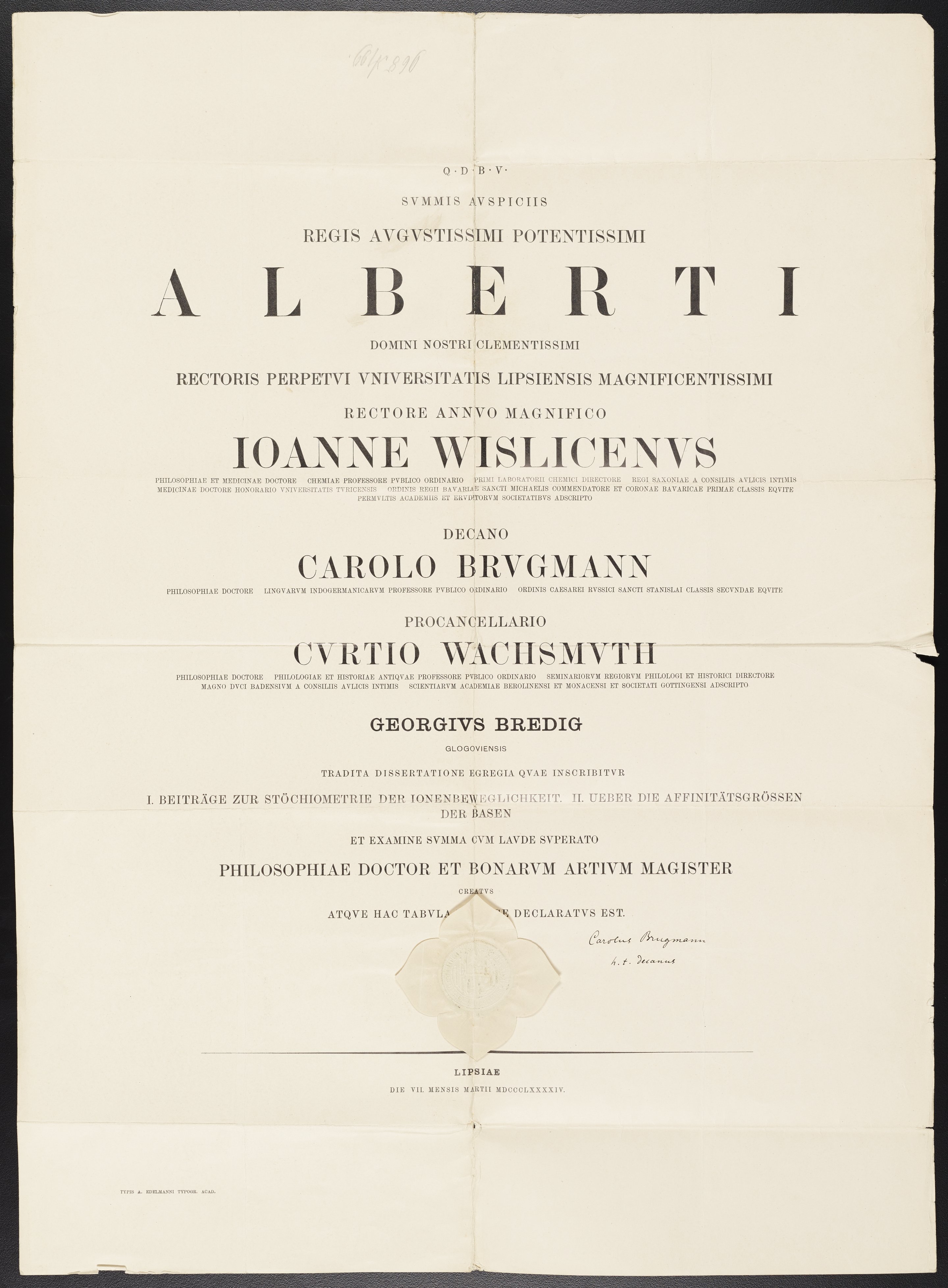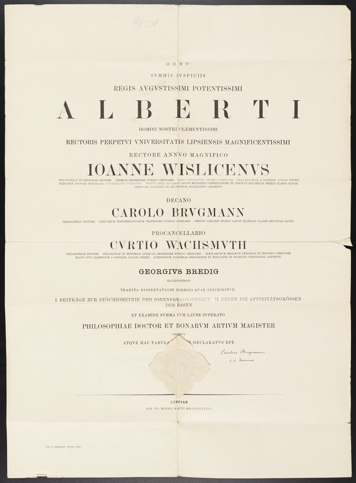 Universität Leipzig (1409-1953). “Georg Bredig's Doctoral Diploma,” 1894. Papers of Georg and Max Bredig, Box 6, Folder 1. Science History Institute. Philadelphia. https://digital.sciencehistory.org/works/rcgynxk.
