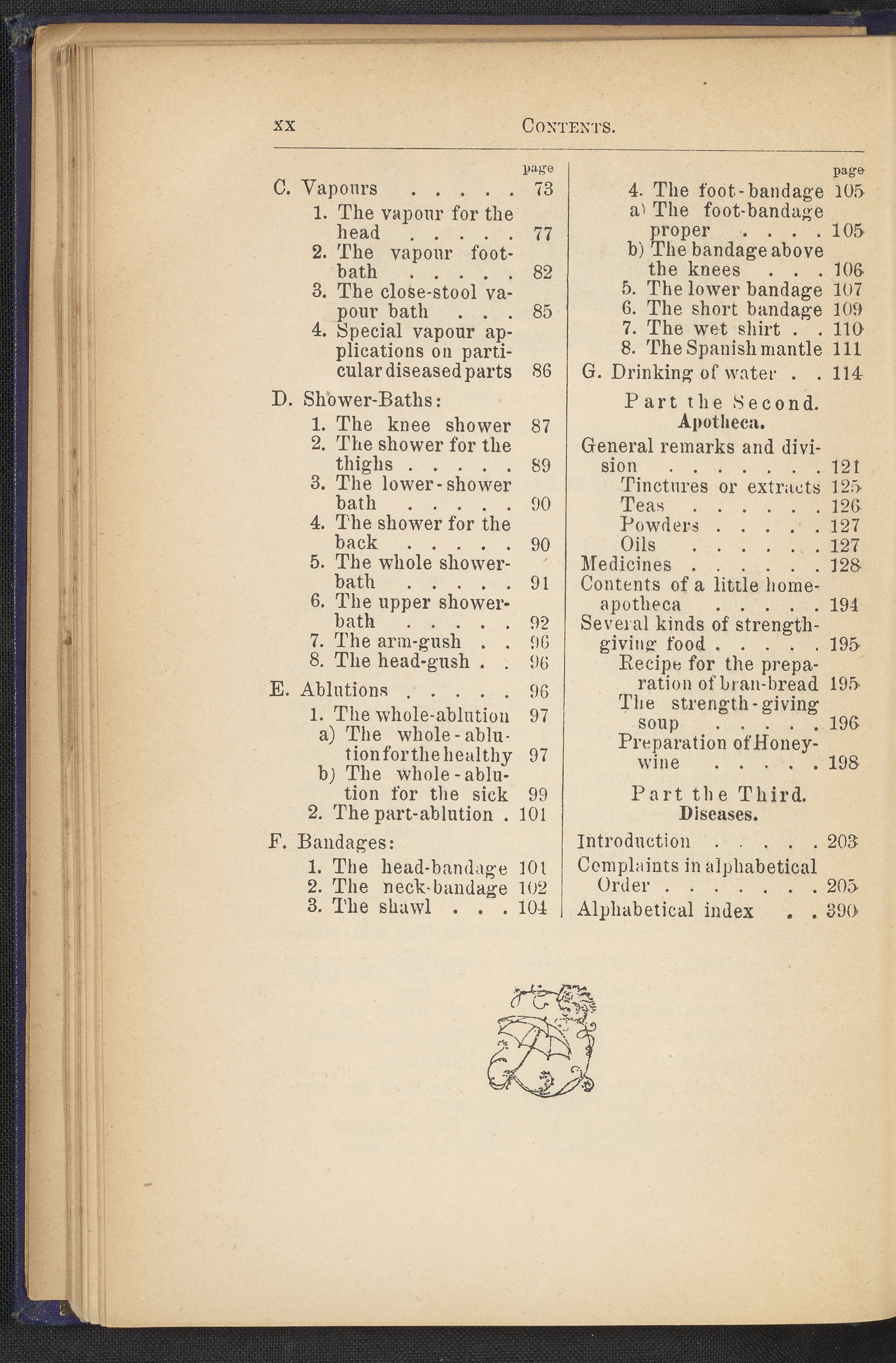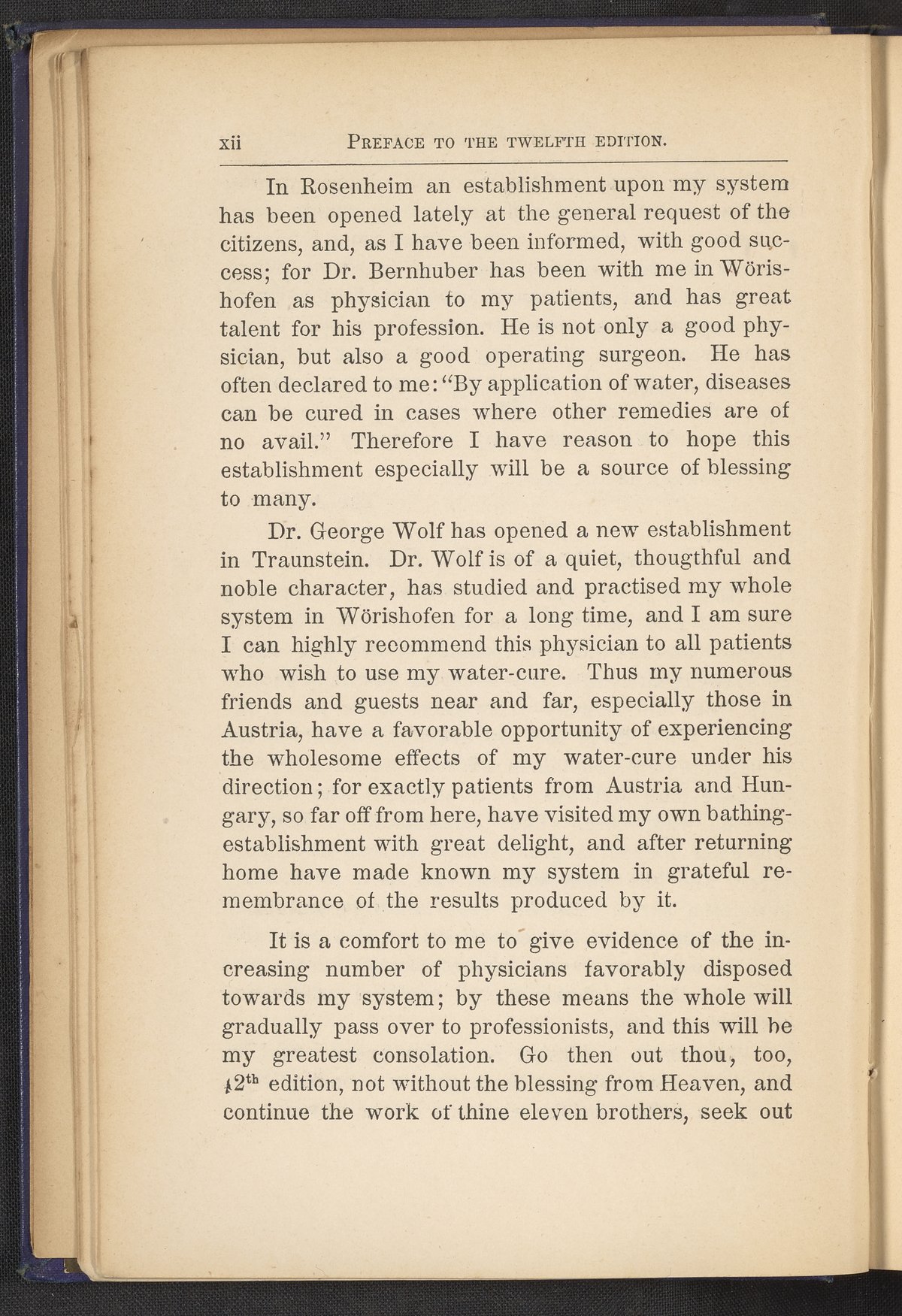 Small JPG1200 x 1689px — 455 KBFull-sized JPG2355 x 3314px — 1.5 MBOriginal fileTIFF — 2355 x 3314px — 22.4 MBSebastian Kneipp (1821-1897) was a Bavarian priest and one of the forefathers of the naturopathic medicine movement. He is known for the "Kneipp Cure", a form of hydrotherapy using the application of water through various methods, temperatures, and pressures to produce therapeutic or healing effects. Kneipp wrote My Water Cure to fulfill his calling to care for people who lack "either means or convenience to have recourse to medical aid in their maladies." Content is divided into three parts, each providing a detailed discussion of the medical applications of water, apotheca (i.e. pharmaceuticals), and diseases. Each section is thoroughly illustrated. The work was first published in German in 1886, and due to its popularity, subsequently inspired numerous editions and translations. This volume, digitized in its entirety, is the only authorized and complete English edition.