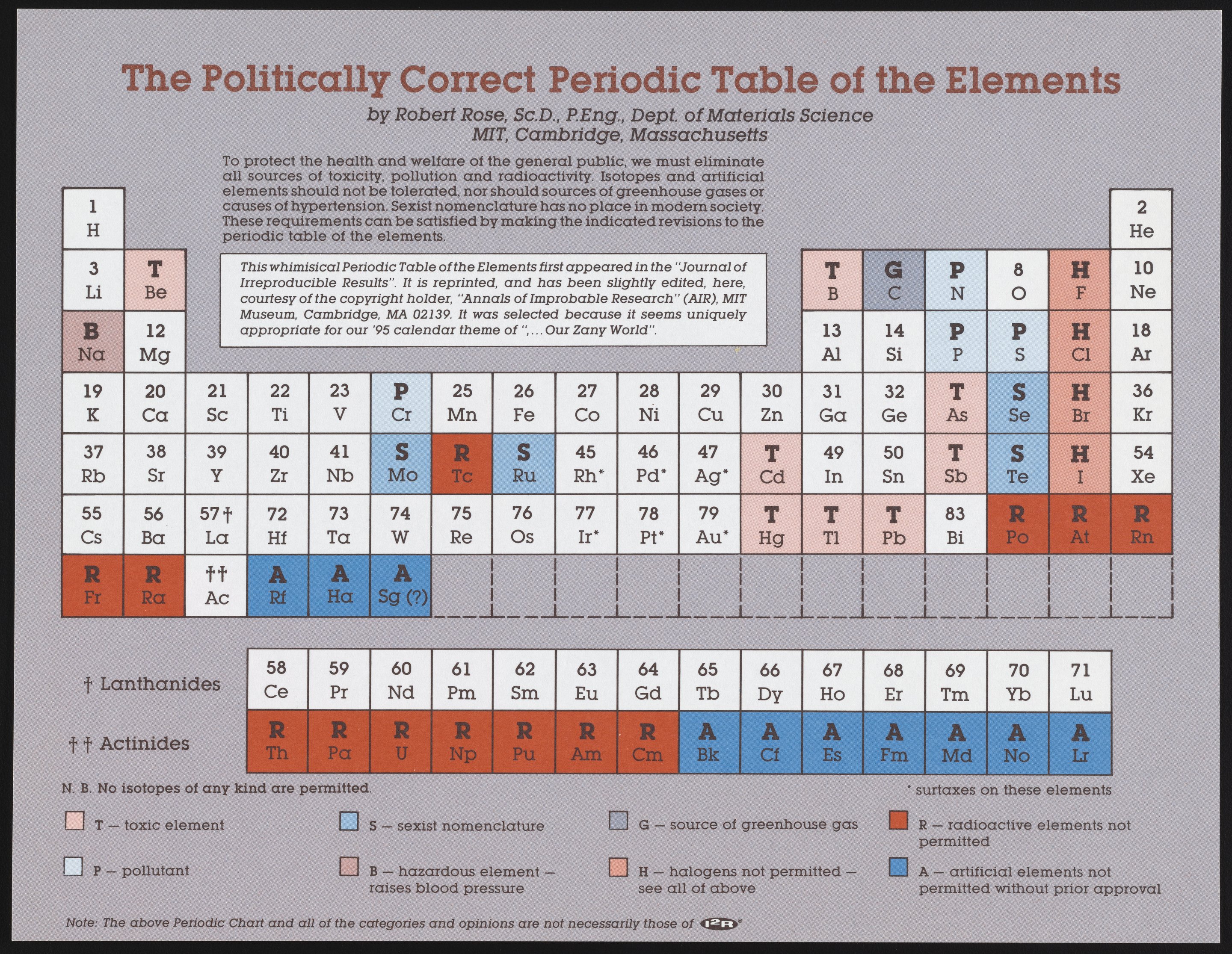 Rose, Robert. “The Politically Correct Periodic Table of the Elements.” Cheltenham (Township), Pennsylvania: Instruments for Research and Industry, circa 1995. Periodic Tables Collection, Box FC-5, Folder Periodic Tables (Assorted). Science History Institute. Philadelphia. https://digital.sciencehistory.org/works/rf55z8701.