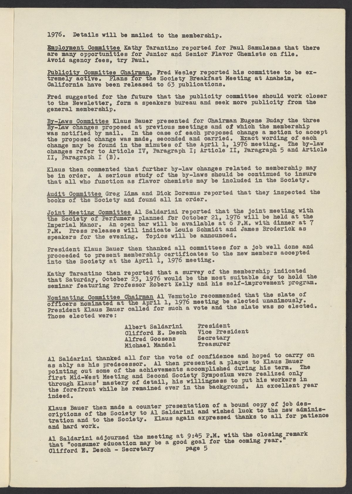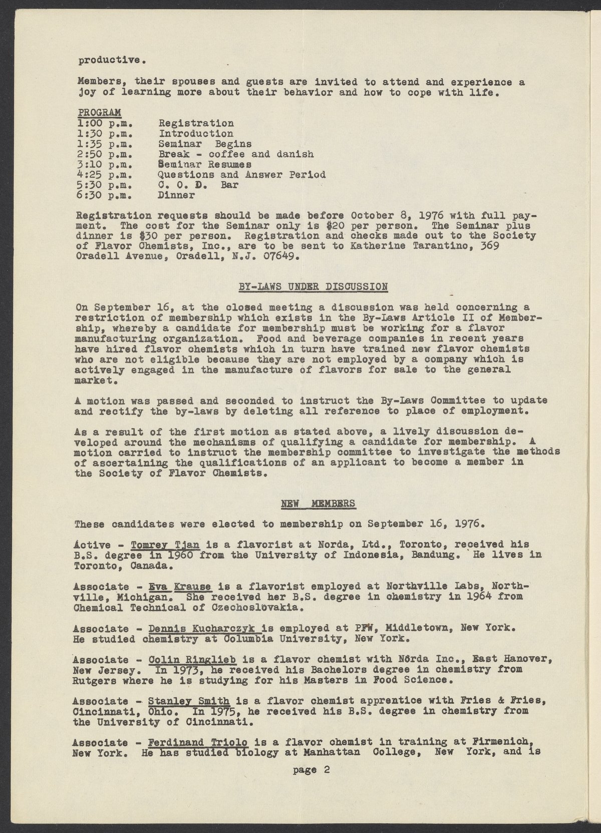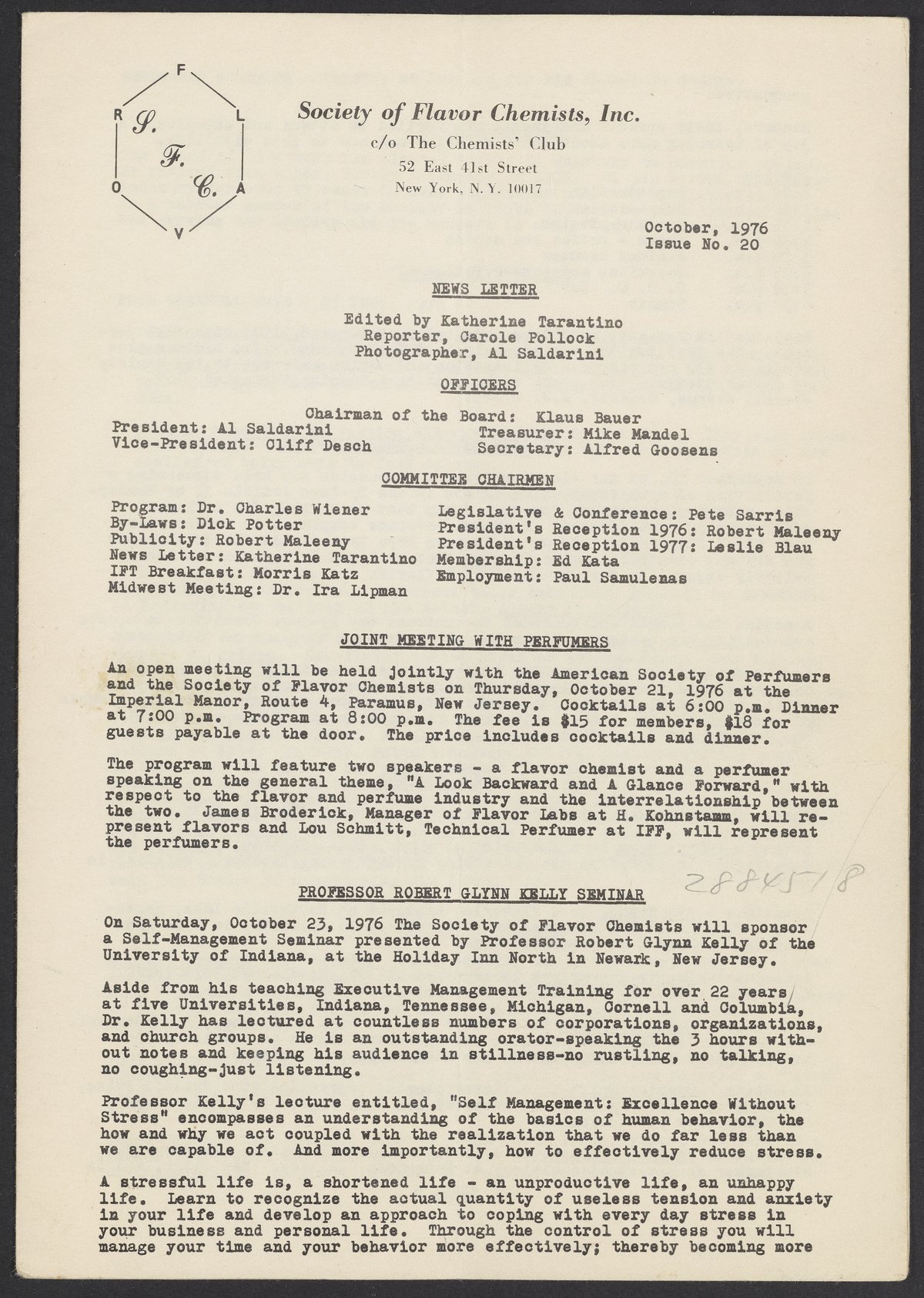 Society of Flavor Chemists. “Society of Flavor Chemists Newsletter, October 1976,” October 1976. Society of Flavor Chemists Newsletters and Certificate of Incorporation, Box 1, Folder 1. Science History Institute. Philadelphia. https://digital.sciencehistory.org/works/rfjzdyh.