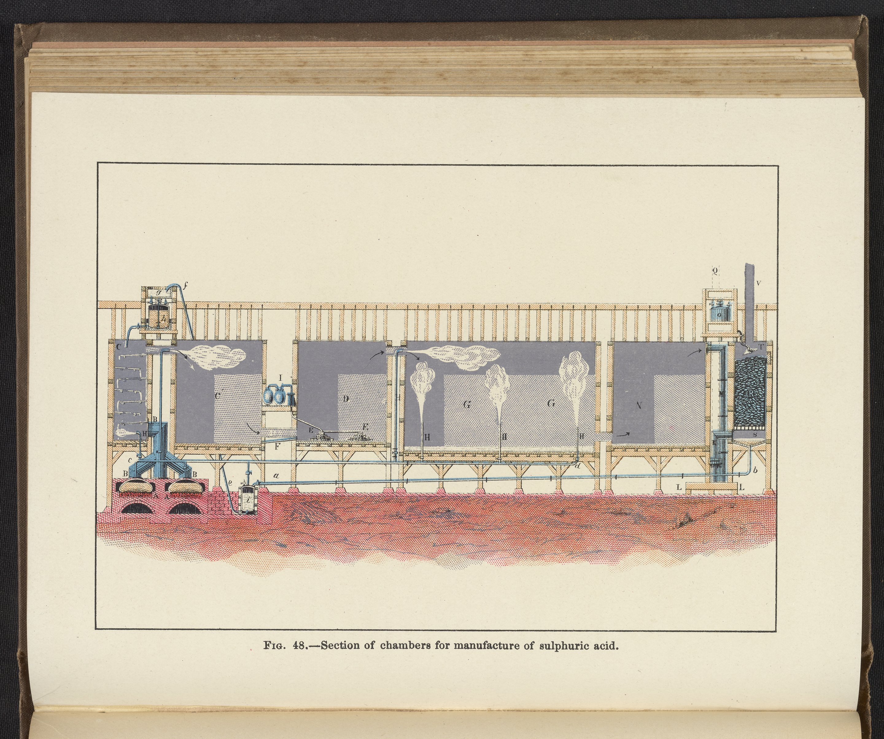 Appleton, John Howard. “Figure 48: Section of Chambers for Manufacture of Sulfuric Acid.” Chemistry, Developed by Facts and Principles Drawn Chiefly from the Non-Metals. Providence, Rhode Island: Providence Lithograph Company, 1884. Science History Institute. Philadelphia. https://digital.sciencehistory.org/works/rfwtjns.