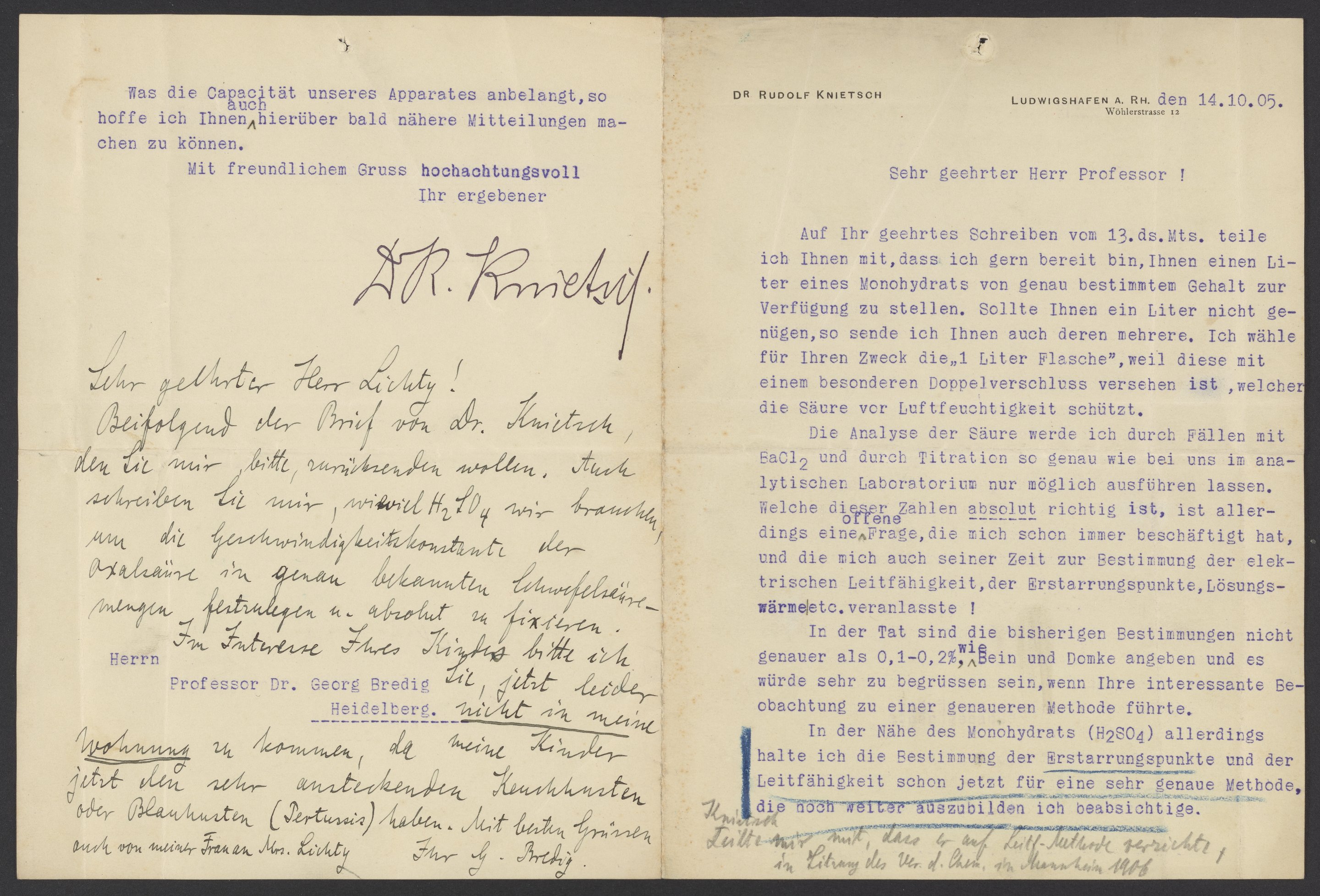 Beifolgend der Brief von Dr. Knietsch, den Sie mir bitte, zurücksenden wollen. Auch schreiben Sie mir, wieviel H2SO4 wir brauchen, um die Geschwindigkeitskonstante der Oxalsäure in genau bekannten Schwefelsäuremengen festzulegen u. absolut zu fixieren.