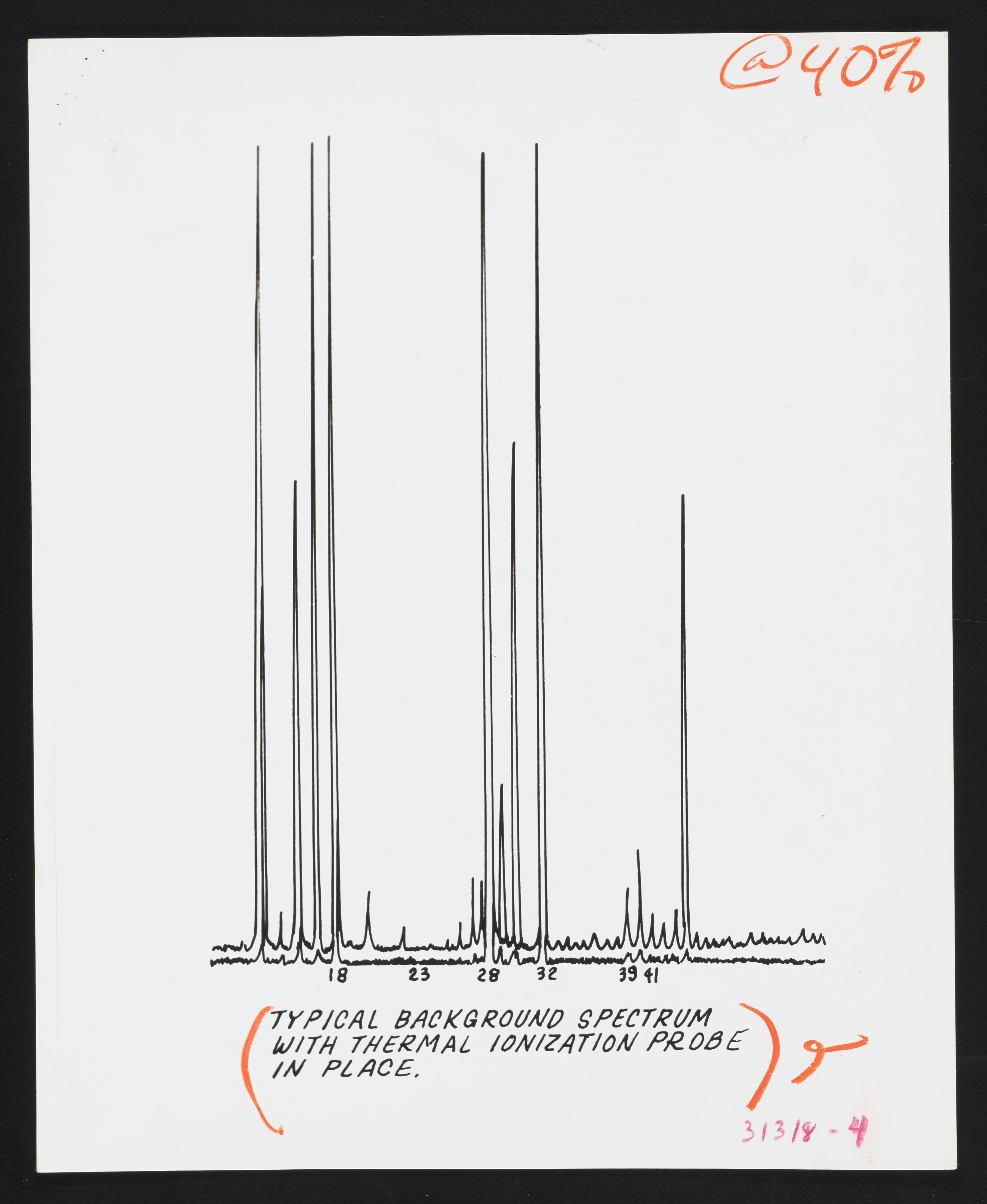 Bendix Corporation. “Diagram Depicting Background Spectrum Reading for Bendix Mass Spectrometer,” 1960–1969. Photographs from the Bendix Time-of-Flight Mass Spectrometer Collection, Box 1. Science History Institute. Philadelphia. https://digital.sciencehistory.org/works/rj430462h.