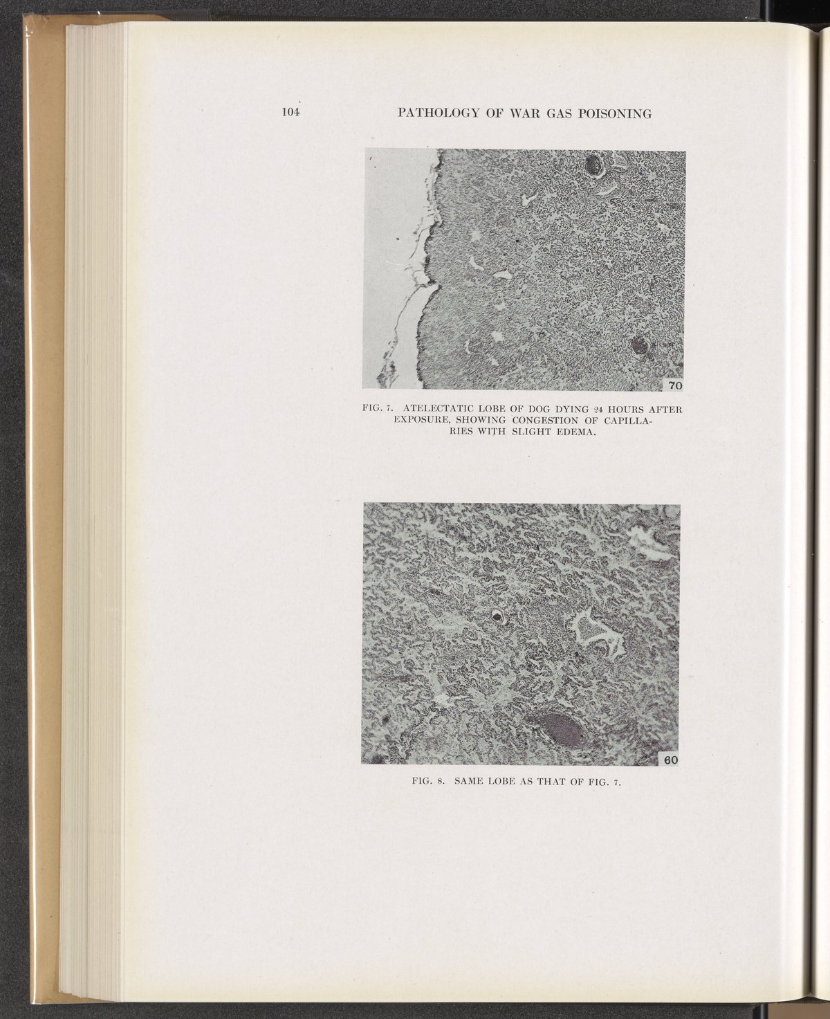 Winternitz, M. C. (Milton C.). “Fig. 7: Atelectatic Lobe of Dog Dying 24 Hours after Exposure, Showing Congestion of Capillaries with Slight Edema. Fig. 8: Same Lobe as That of Fig. 7.” Collected Studies on the Pathology of War Gas Poisoning. New Haven, Connecticut: Yale University Press, 1920. https://digital.sciencehistory.org/works/rj430475k.