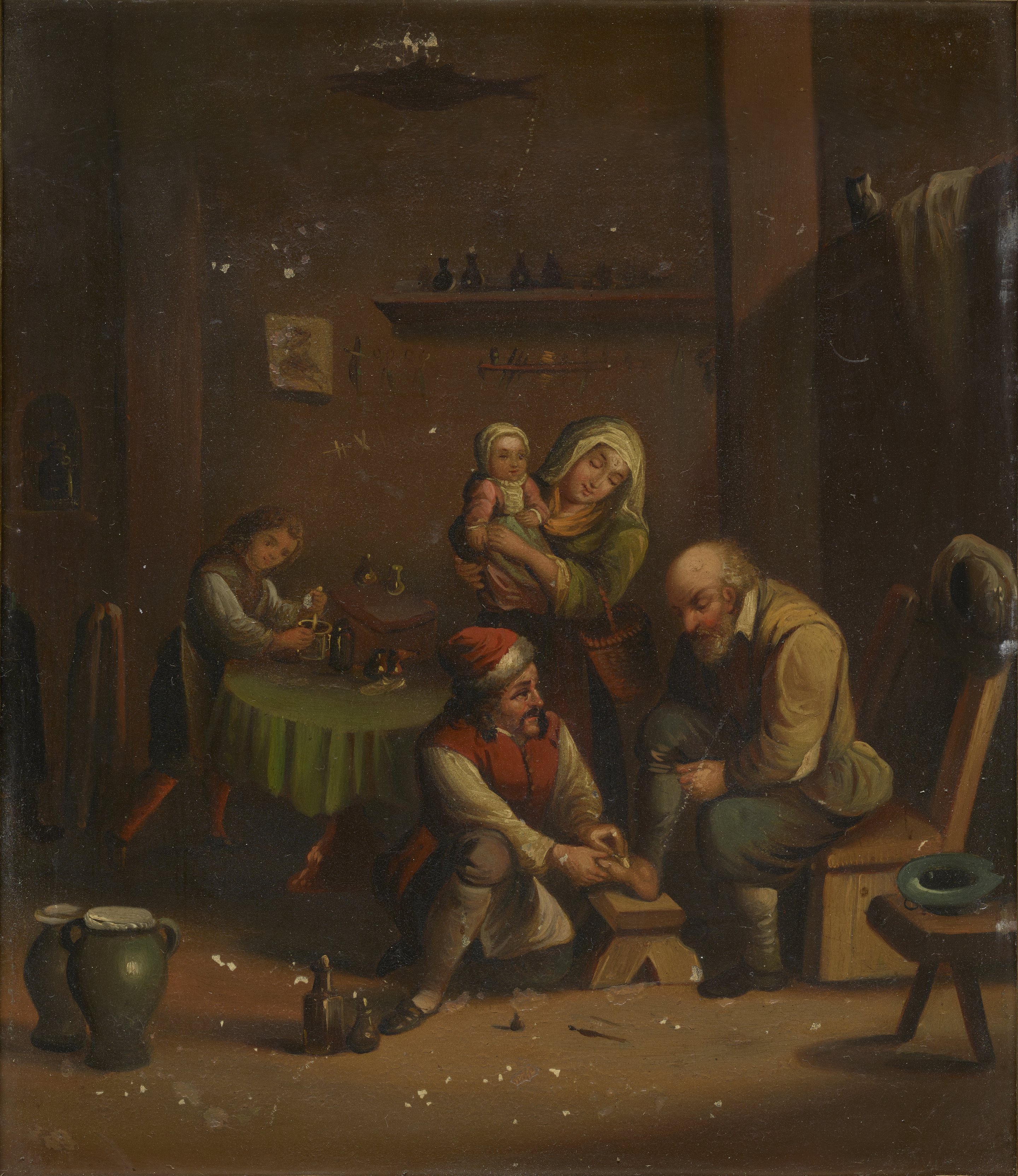 In a small workshop a medical alchemist tends to the foot of a seated patient while the man's wife and child look on. At left, an assistant grinds a substance--likely a medicine or salve--in a small mortar and pestle. The humble shop is furnished with a table, a small shelf of vials and jars, and a paper print pasted against the rear wall. This painting was produced by adhering a lithographic print to a thin metal plate and painting over the top of it in oil.