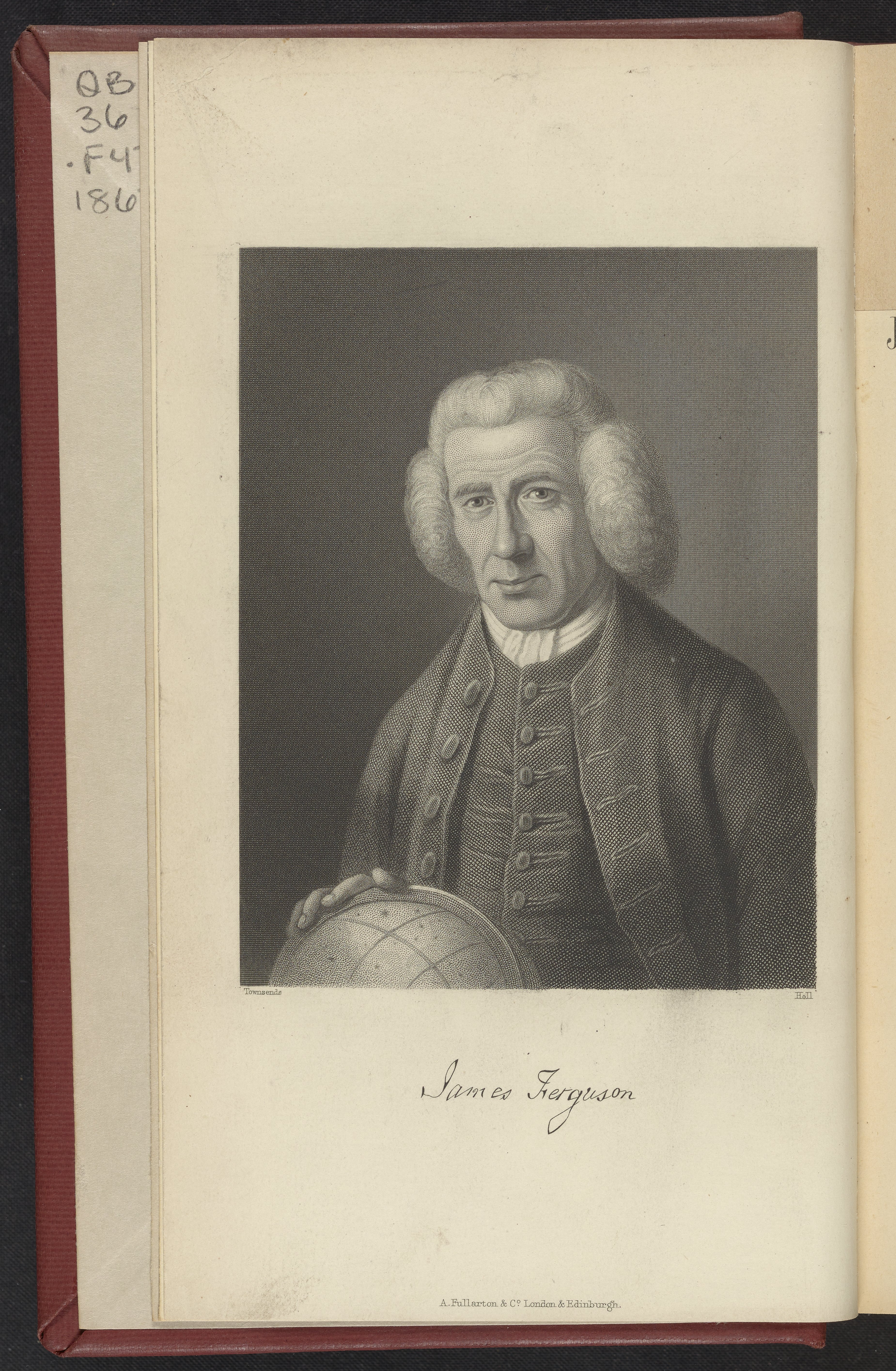 Frontispiece portrait engraving of James Ferguson. In this half-bust portrait engraving, Ferguson is posed with his hand on a celestial globe. His facsimile signature can be found underneath the portrait.