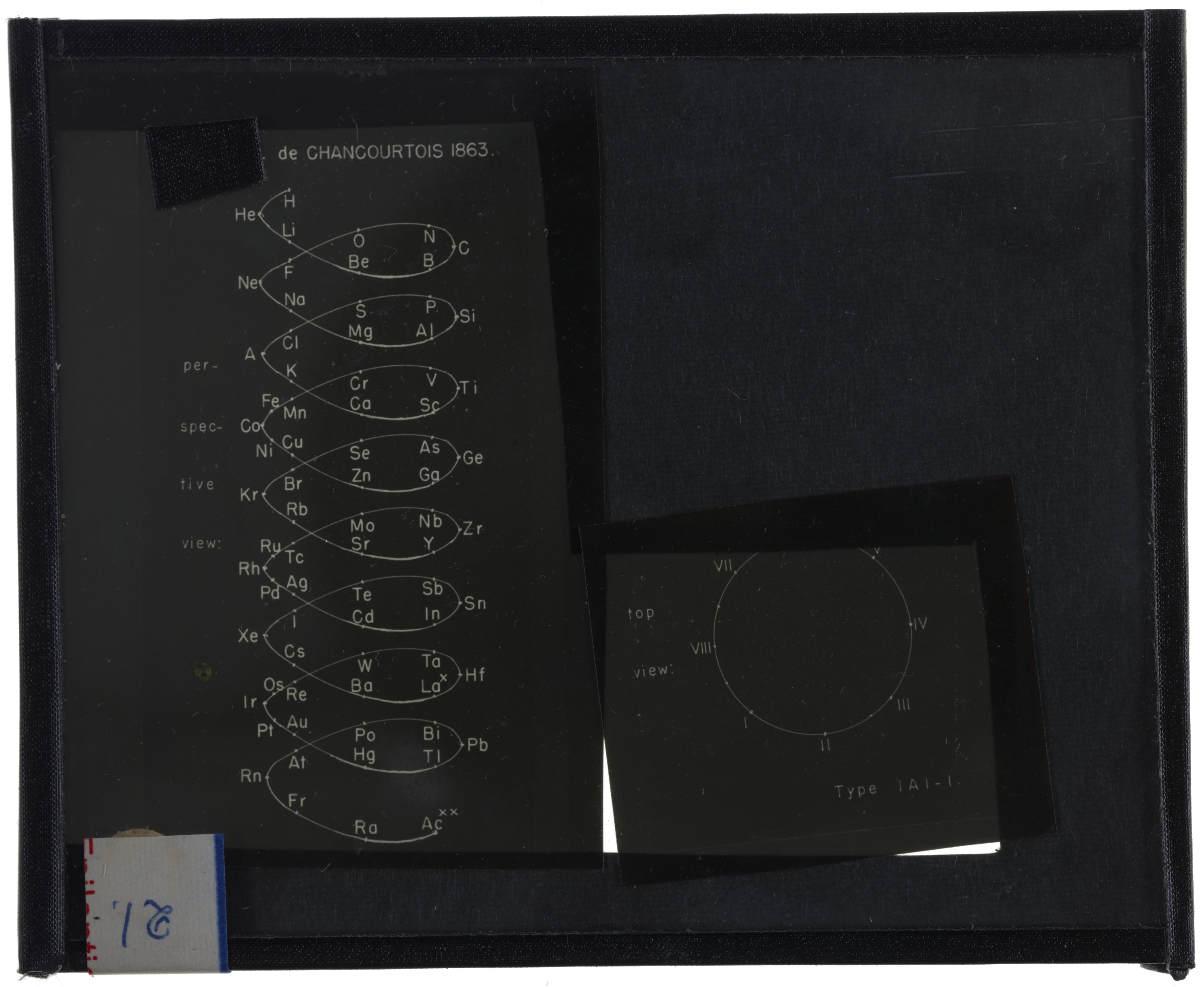 Periodic table in the style of a zigzag (James Emerson Reynolds, 1886)1886 (Original design), Circa 1957 (Date attributed to slide)