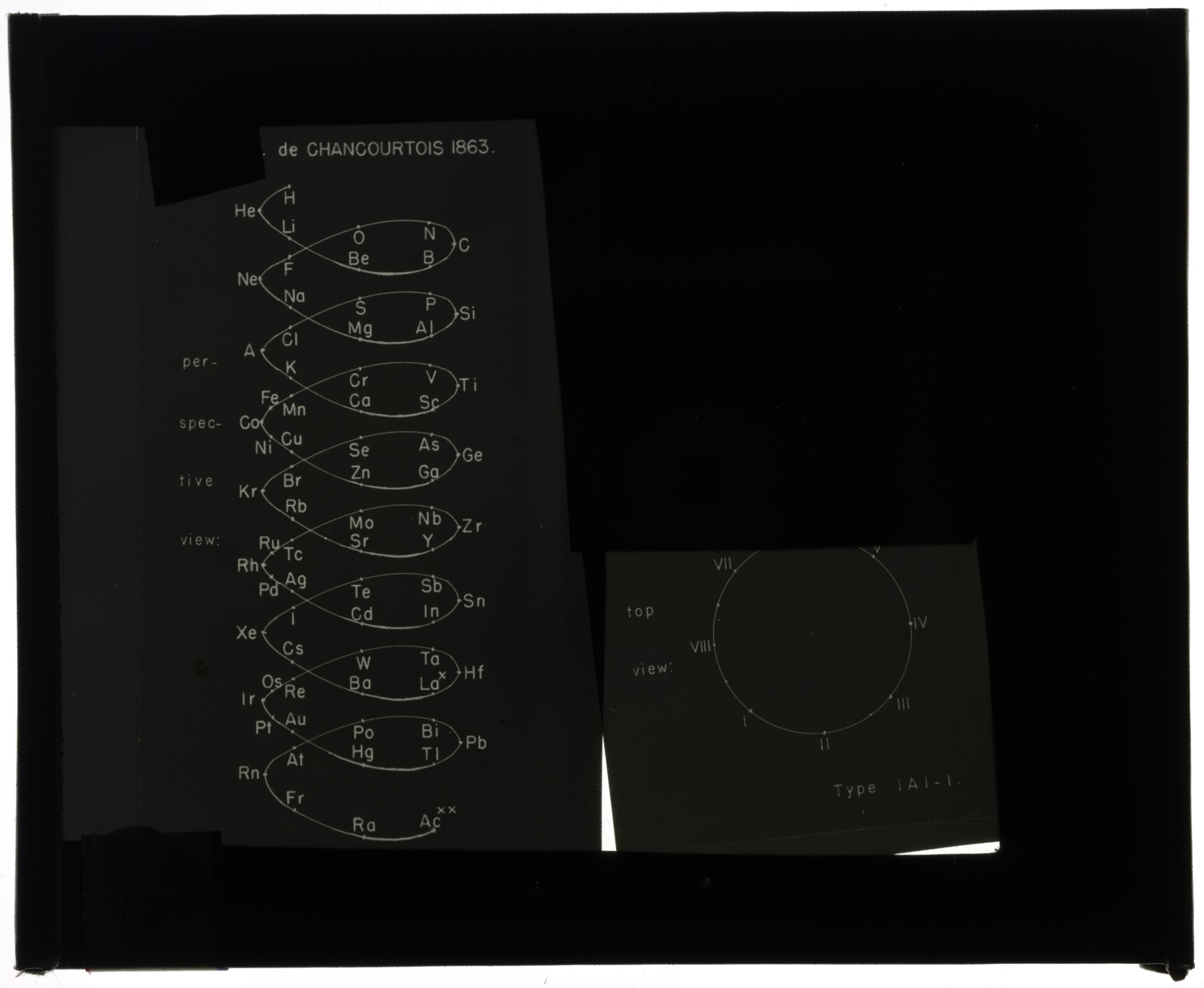 Periodic table in style of helix drawn on one cylinder1863 (Original design), Circa 1957 (Date attributed to slide)