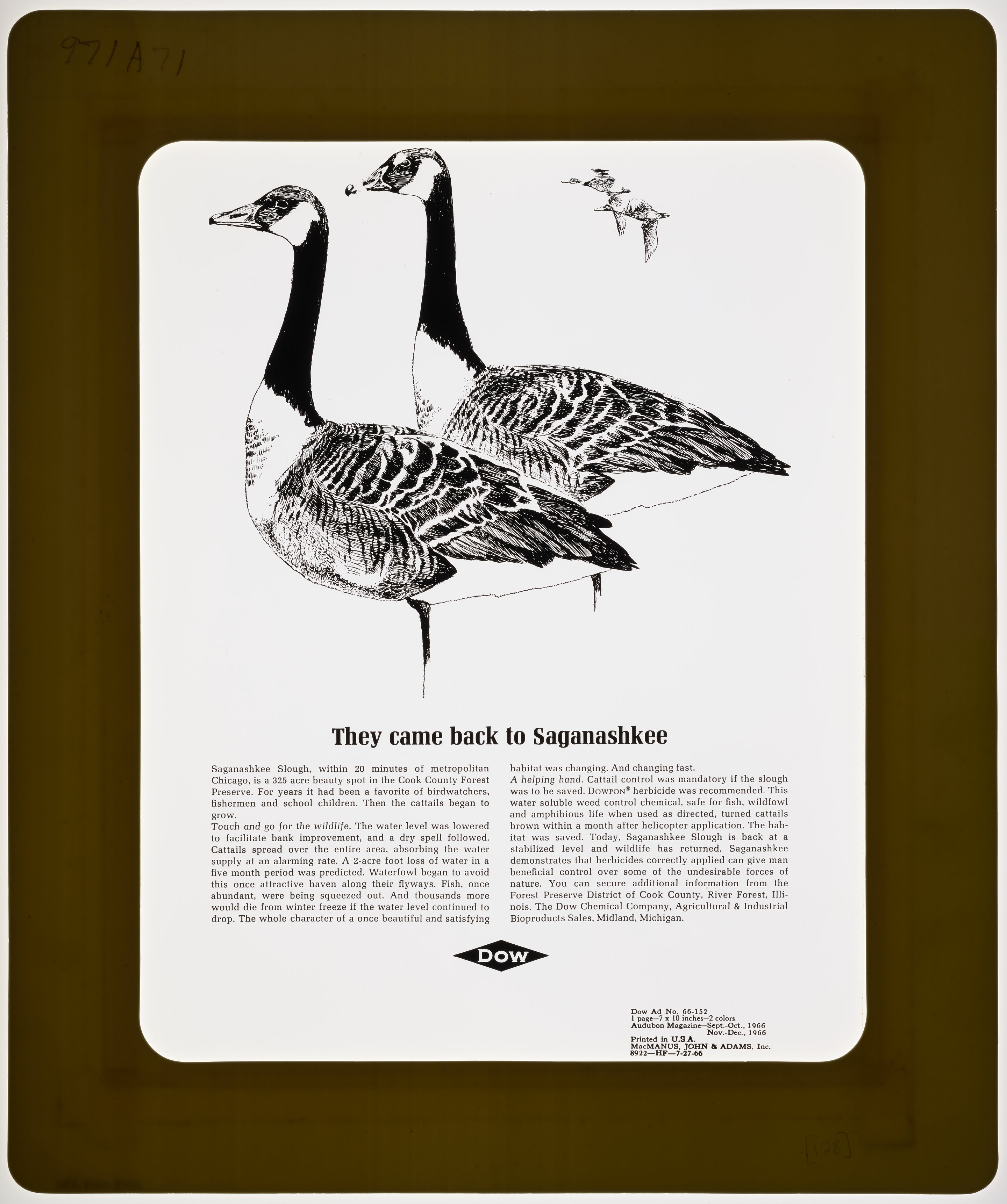 Transparency copy of a print advertisement for Dowpon, a herbicide marketed and sold by the Dow Chemical Company. The advertisement features an illustration of several waterfowl, with accompanying text detailing the impact of weeds like cattail on the Saganashkee Slough near Chicago. The text goes on to extol the benefits of Dowpon for weed control and its successful application to restore the natural environment of the slough.