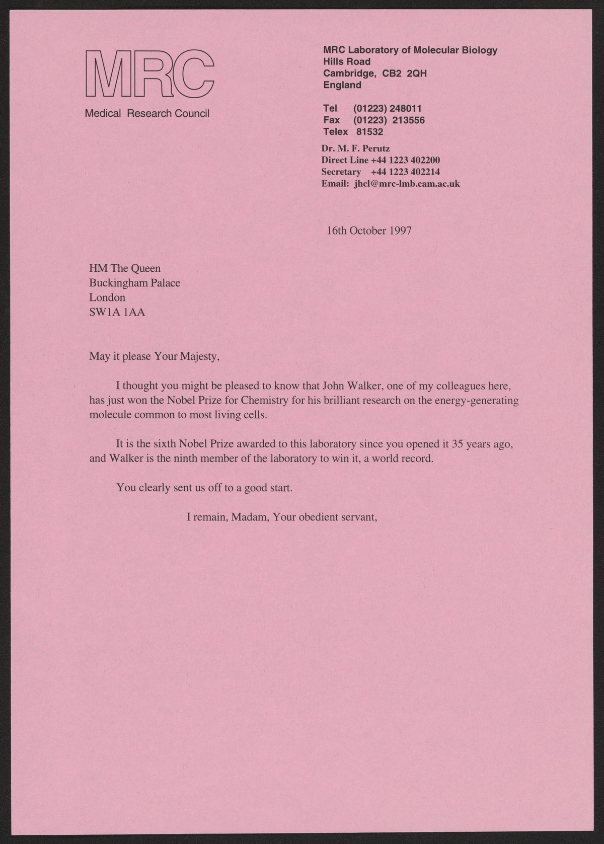 Letter from Max Perutz to Queen Elizabeth II, October 16, 1997
