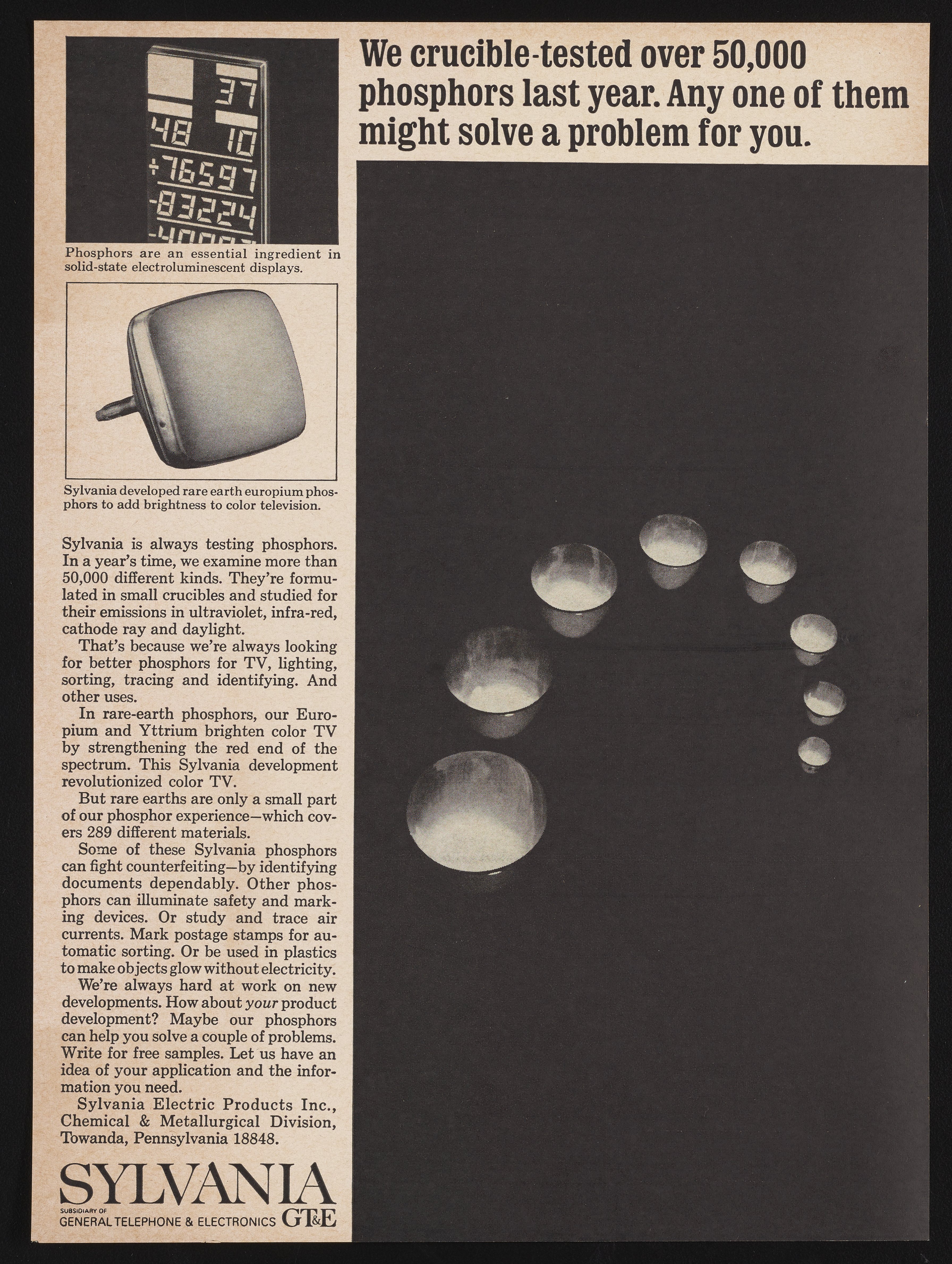 GTE Sylvania Incorporated. “We Crucible Tested over 50,000 Phosphors Last Year. Any One of Them Might Solve a Problem for You.” Paper (fiber product). New York, New York, 1967. Science History Institute. Philadelphia. https://digital.sciencehistory.org/works/rotgfjl.