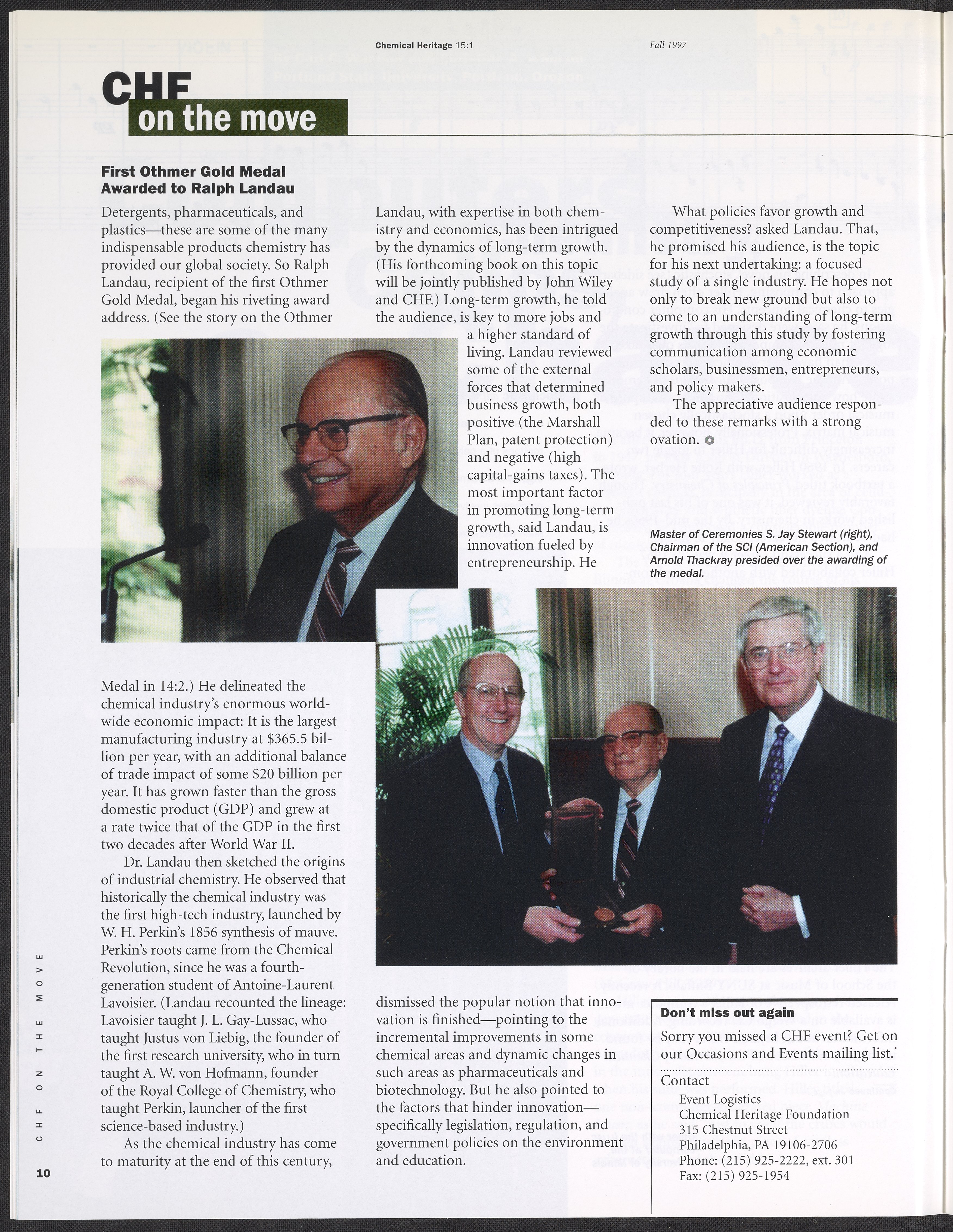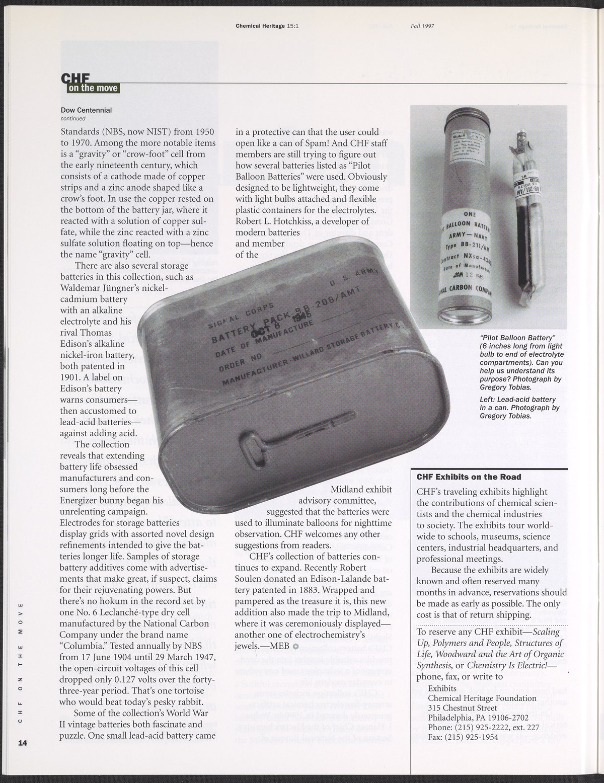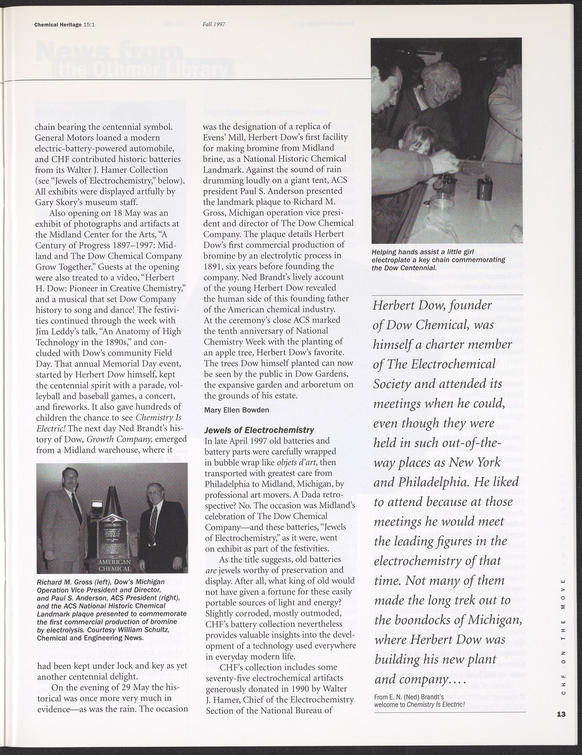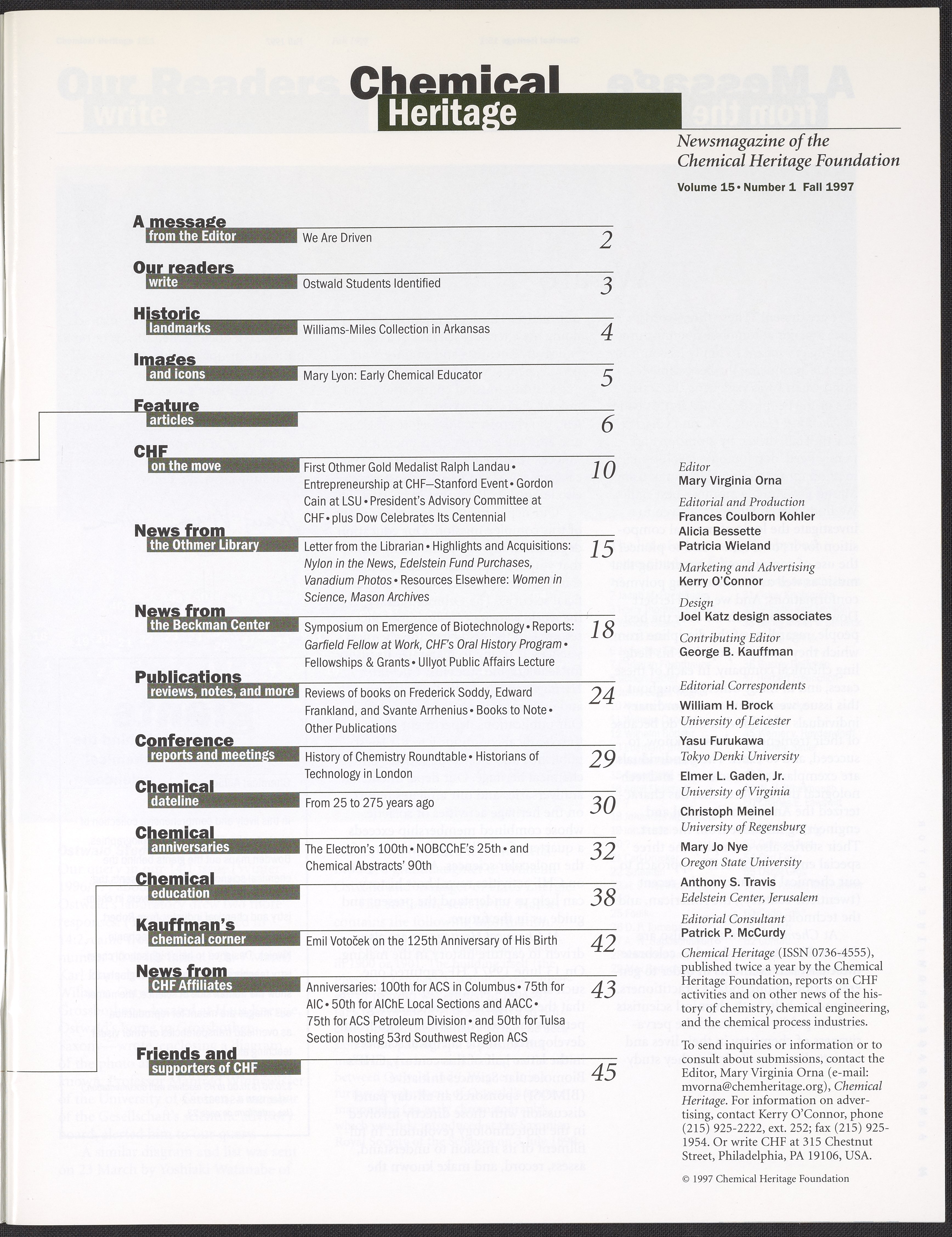 “Chemical Heritage, Volume 15 Number 1.” Philadelphia, Pennsylvania: Chemical Heritage Foundation, 1997. 099C001. Science History Institute. Philadelphia. https://digital.sciencehistory.org/works/row1swz.