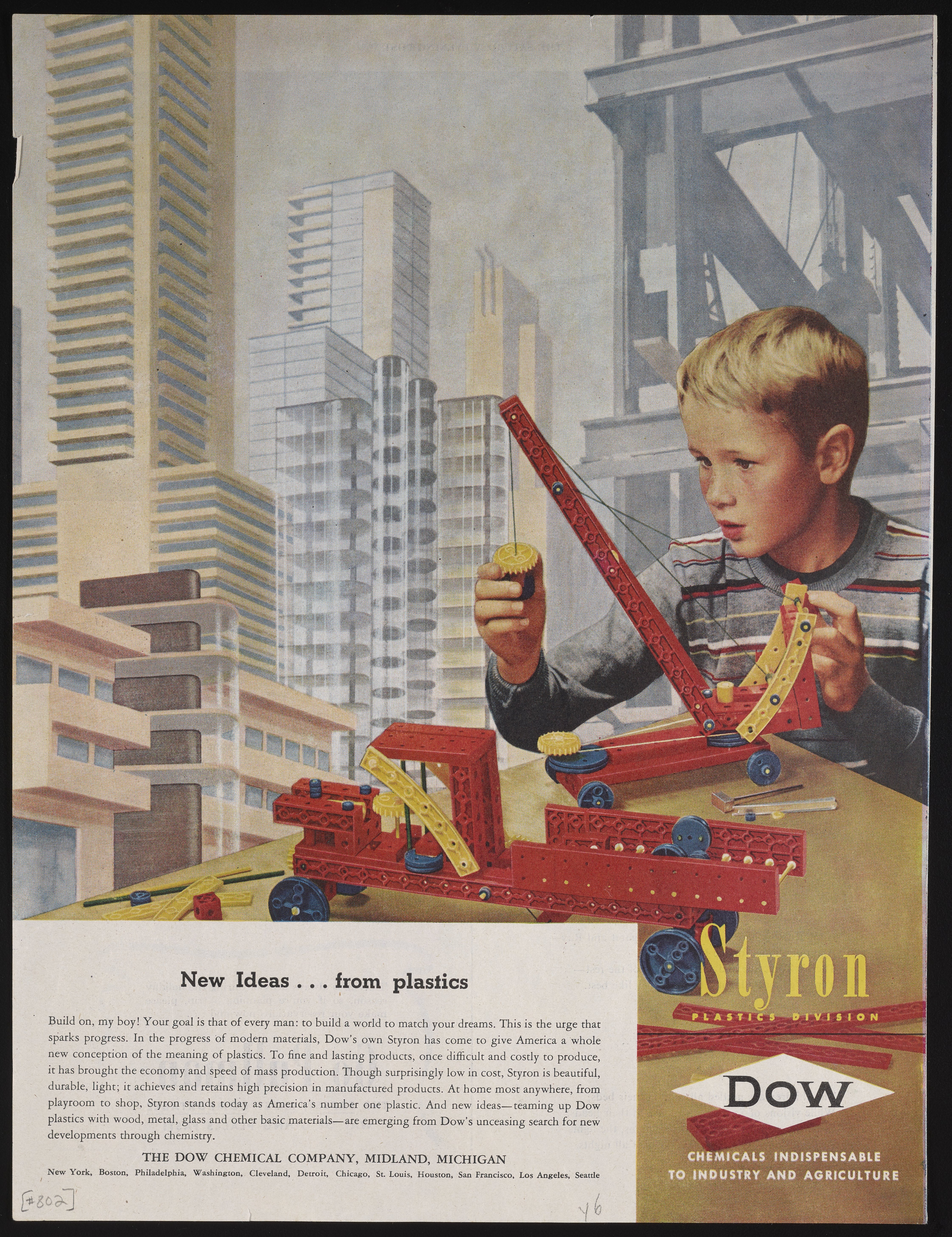 Color print advertisement for Styron, the trade name for Styrenic plastics historically manufactured and sold by the Dow Chemical Company for a variety of consumer applications. The advertisement shows a young boy playing with a plastic construction set, against a backdrop of skyscrapers. The accompanying text promotes the use of plastics for "the economy and speed of mass production." This advertisement appeared in a 1946 edition of The Saturday Evening Post.