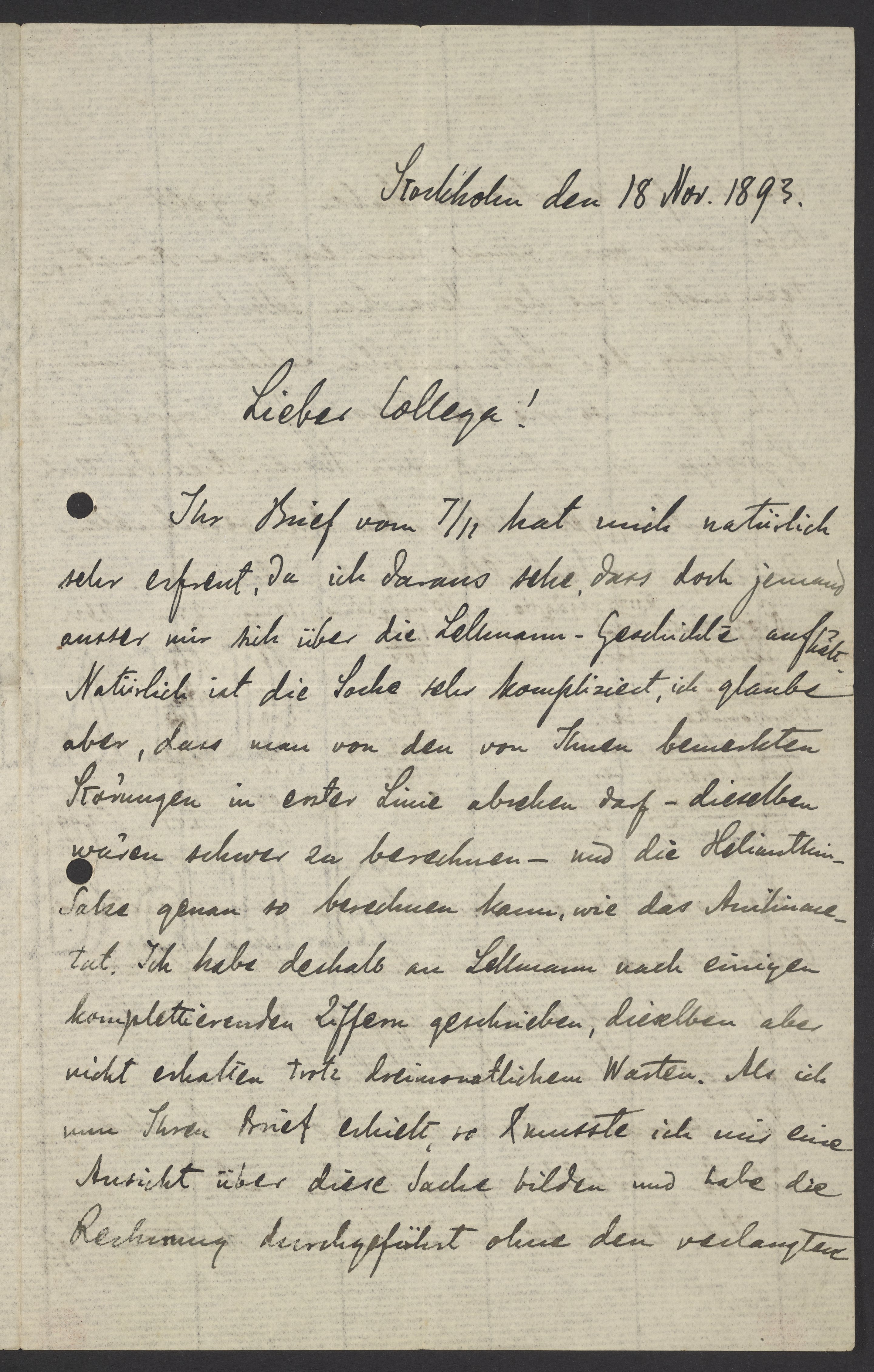 Ihr Brief vom 7/11 hat mich natürlich sehr erfreut, da ich daraus sehe, dass doch jemand ausser mir sich über die Sellmann-Geschichte aufhält. Natürlich ist die Sache sehr kompliziert, ich glaube aber, dass man von den von Ihnen bemerkten Störung in erster Linie absehen darf – dieselben wären schwer zu berechnen – und die Helium-Salze genau so berechnen kann, wie das wie das Anilinase tat. Ich habe deshalb an Sellmann nach einigen komplettierenden Ziffern geschrieben, dieselben aber nicht erhalten trotz dreimonatlichem Warten. Als ich Ihren Brief erhielt, so musste ich nur eine Ansicht über diese Sache bilden und habe die Rechnung durchgeführt, ohne den verlangten