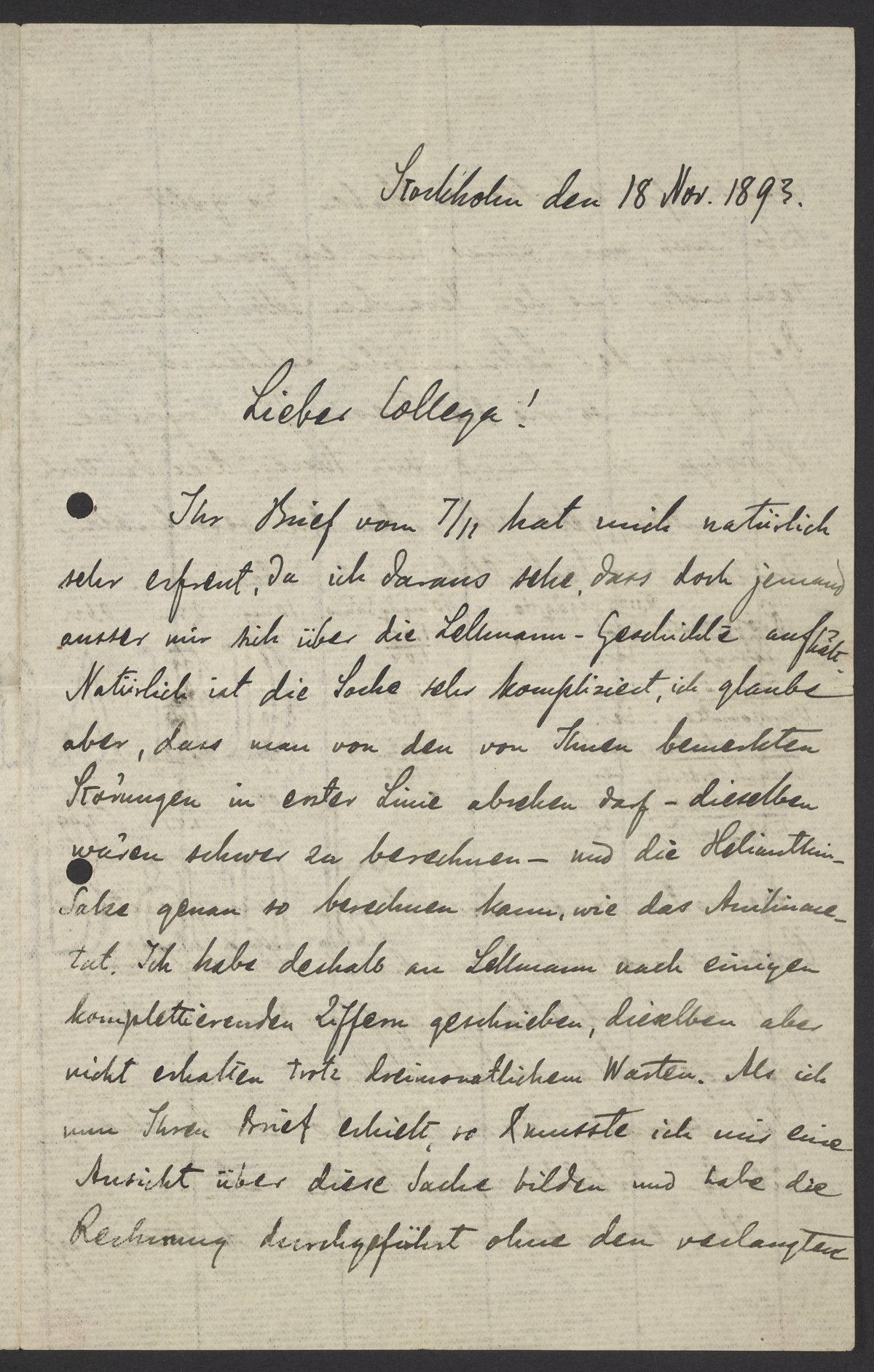 Letter from Svante Arrhenius to Georg Bredig, November 1893