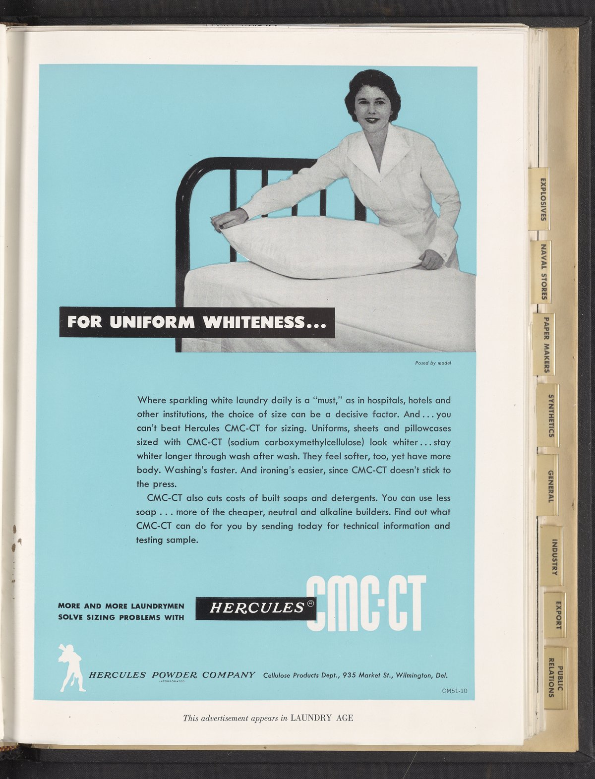 Color print advertisement for Hercules CMC-CT, unpurified cellulose gum manufactured and sold by Hercules Powder Company for use in detergent products. The advertisement shows a uniformed woman arranging linens on a bed. The accompanying text describes the use of Hercules CMC-CT for linen sizing "in hospitals, hotels and other institutions." Here, "sizing" refers to a solution applied to textiles to create soil resistance, add body to the fabric and facilitate ironing. This advertisement appeared in Laundry Age.