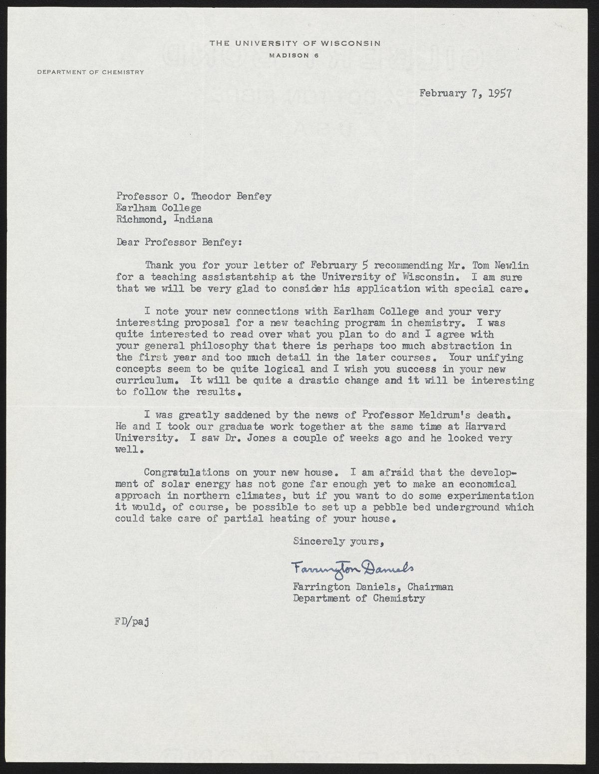 Concerns recommendation of Tom Newlin as a teaching assistant as well as plans for revising the Chemistry program at Earlham College. The last paragraph makes references to the current state of development of solar energy, for which Daniels was an early and leading pioneer.