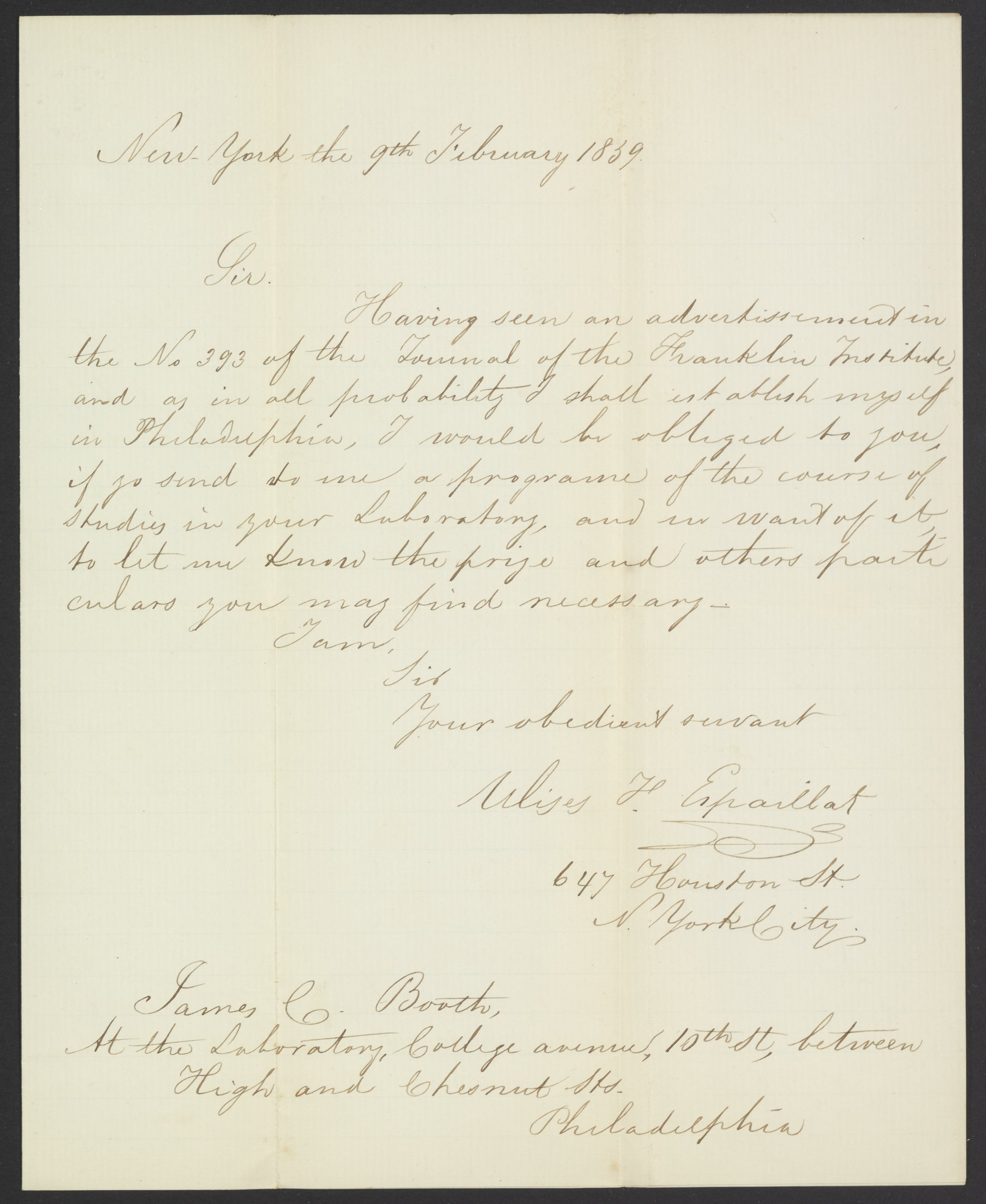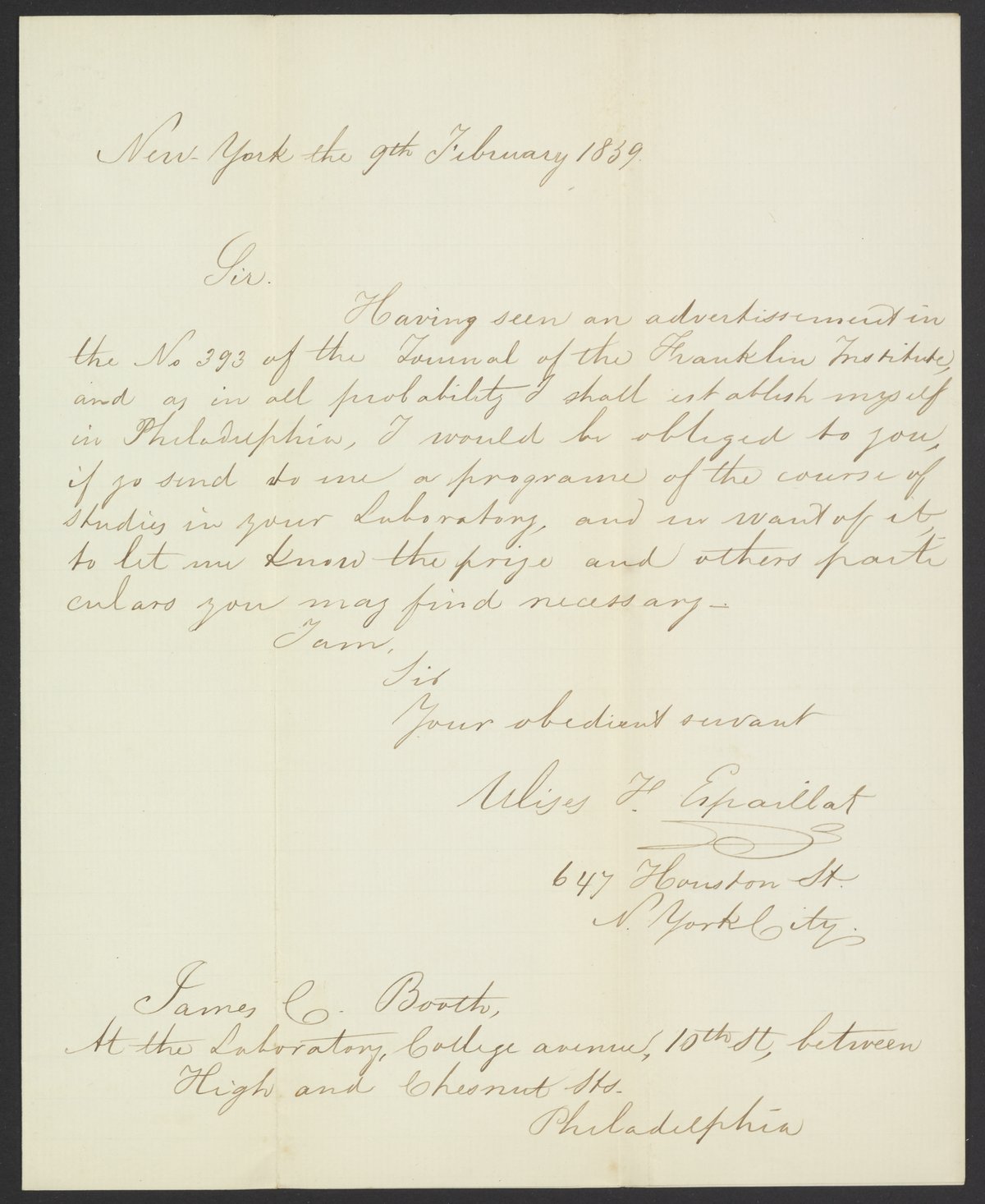 Espaillat, Ulises F. “Letter from Ulises F. Espaillat to James Curtis Booth, February 9, 1859,” February 9, 1859. Papers of James Curtis Booth, Box 1, Folder 7. Science History Institute. Philadelphia. https://digital.sciencehistory.org/works/rs0ys56.