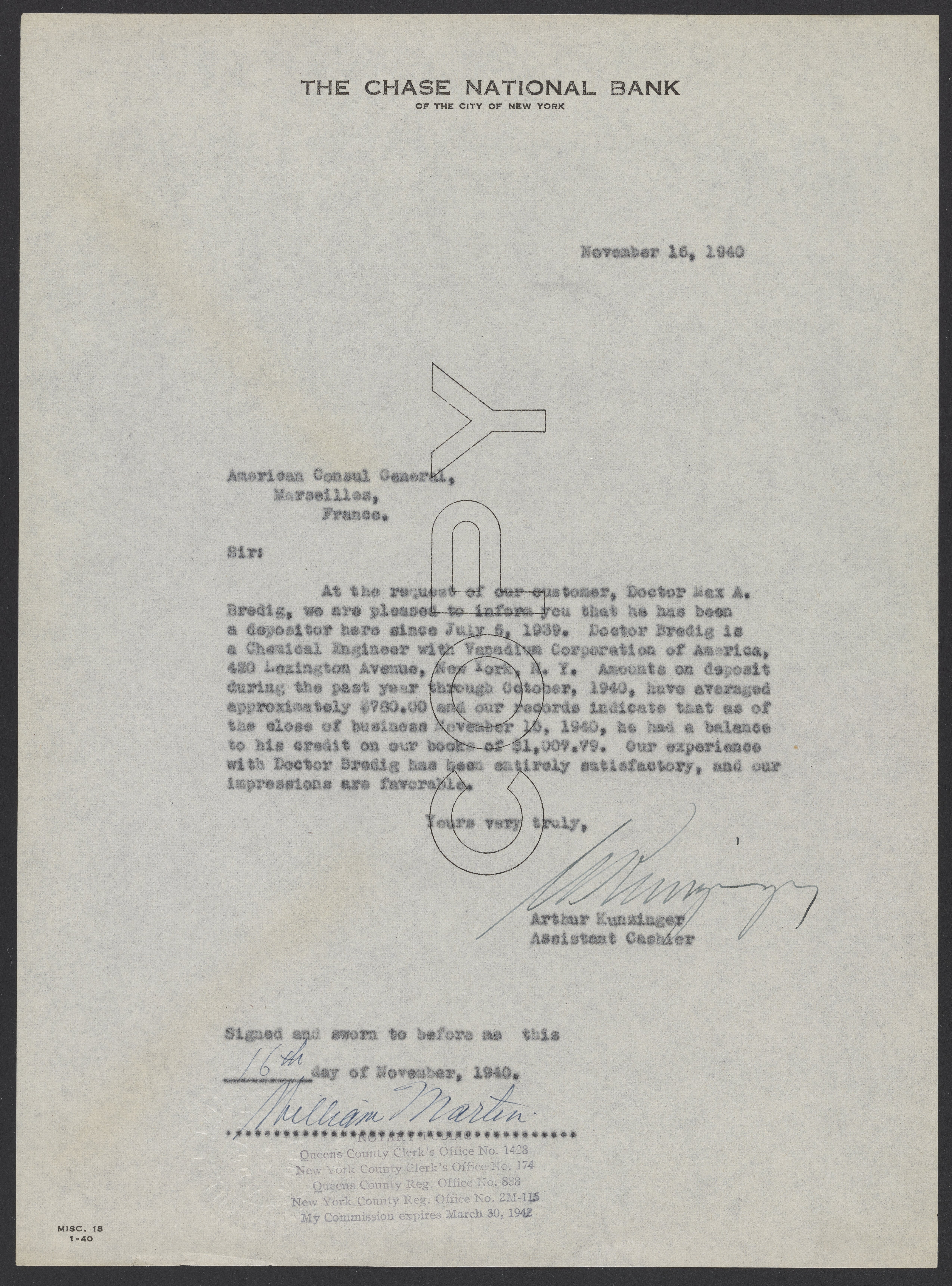 Copy of a letter from Arthur Kunzinger to the American Consul General in Marseilles, France on behalf of Max Bredig (1902-1977). The letter states that Bredig is an employee at Vanadium Corporation of America and provides details of his finances.