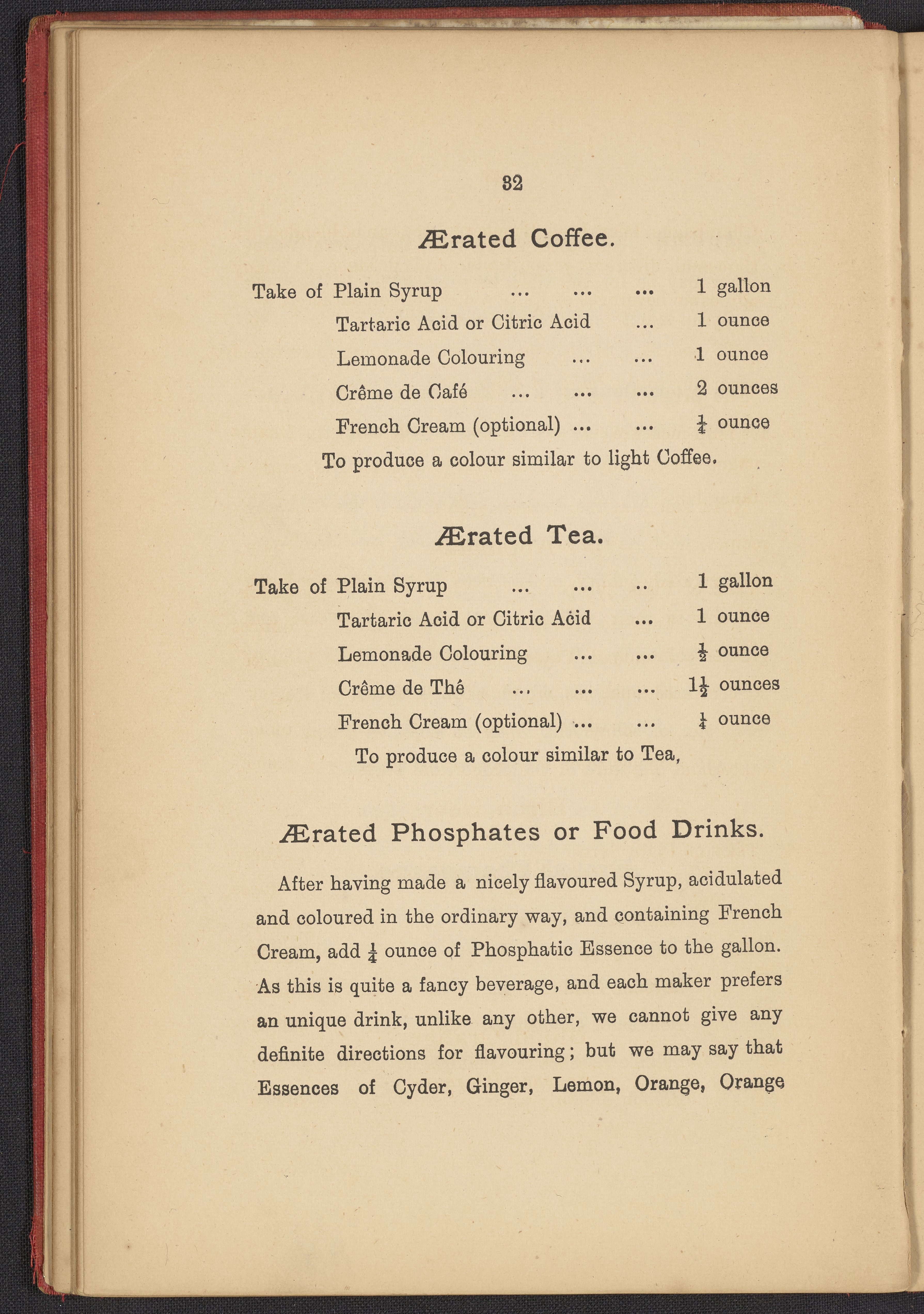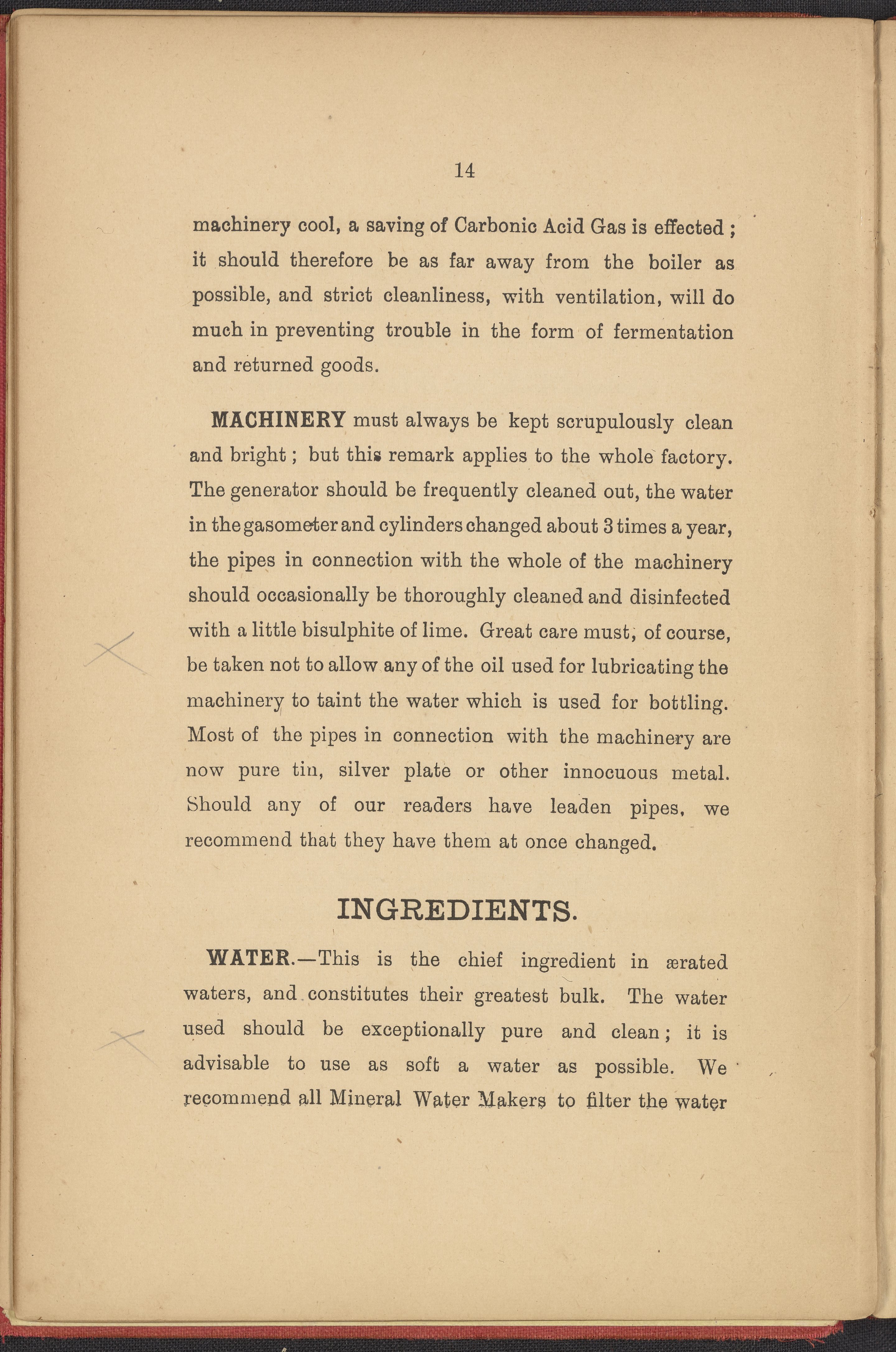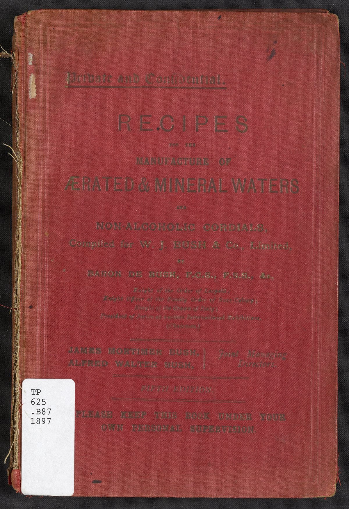 Bush, William Ernest. “Recipes for the Manufacture of Aerated & Mineral Waters and Non-Alcoholic Cordials.” London, England: Little & Son Printers, 1897. TP625 .B87 1897. Science History Institute. Philadelphia. https://digital.sciencehistory.org/works/ru09hu5.