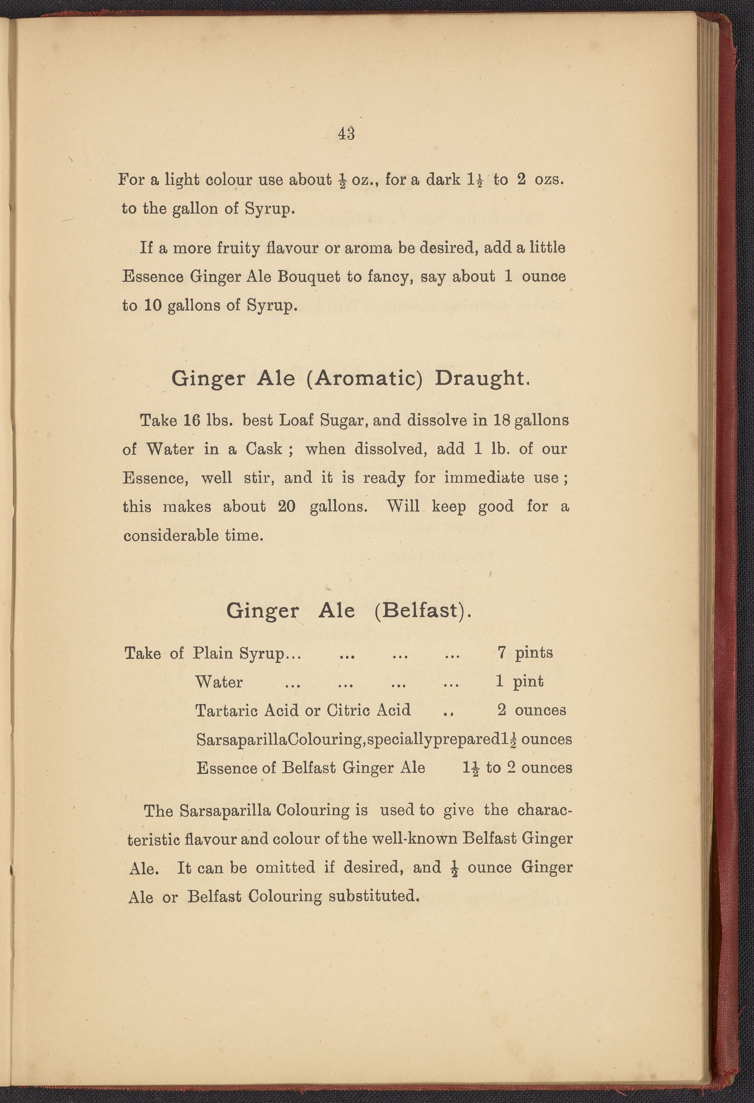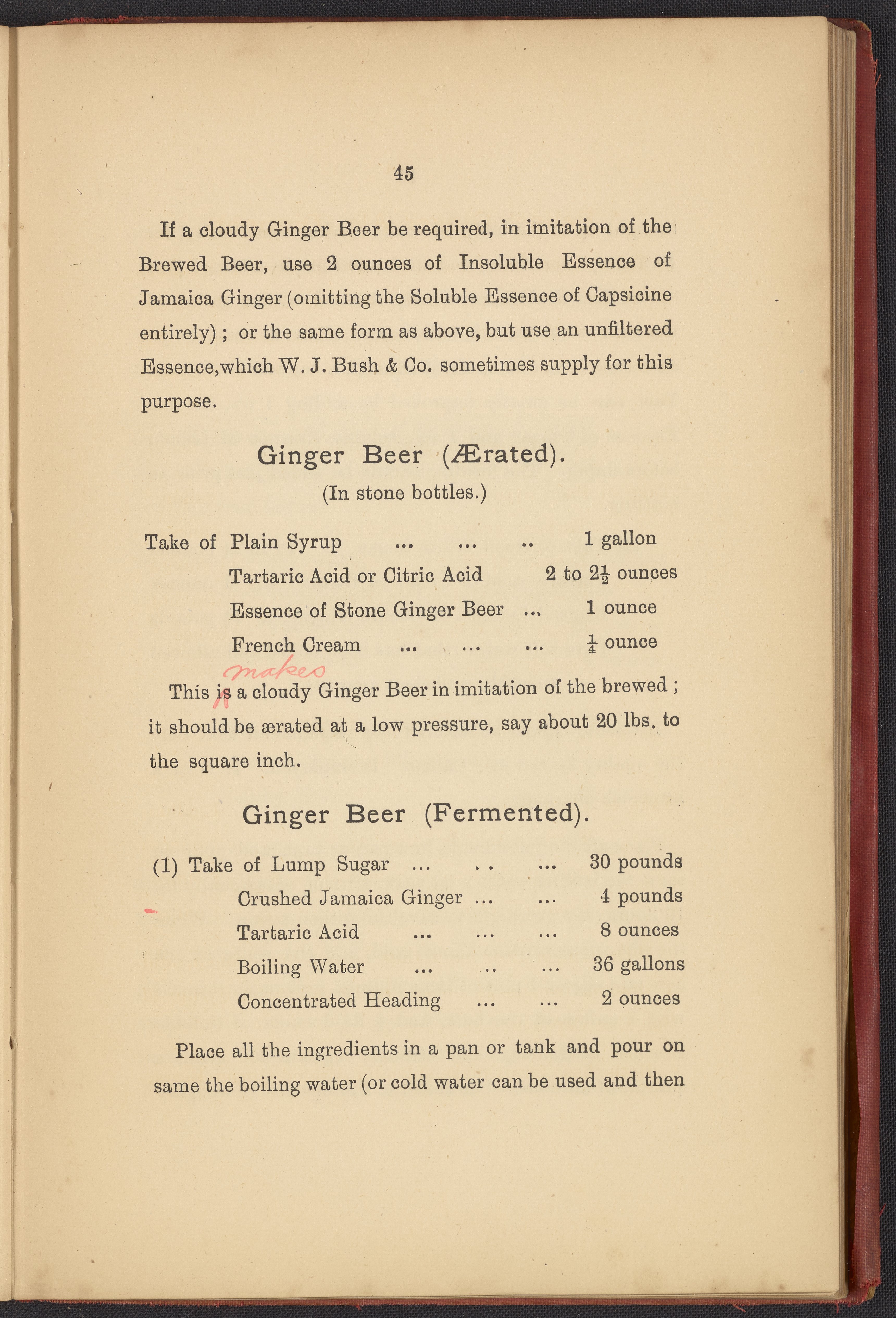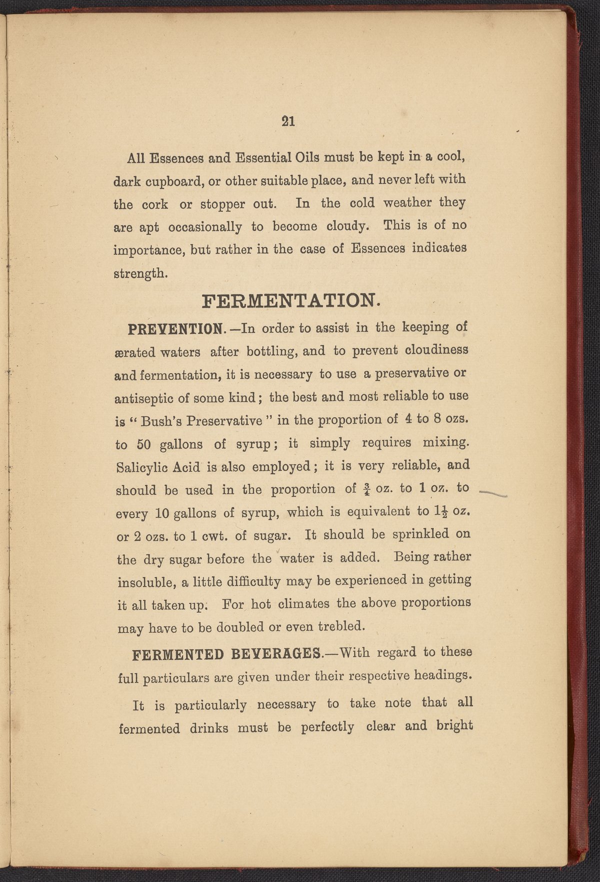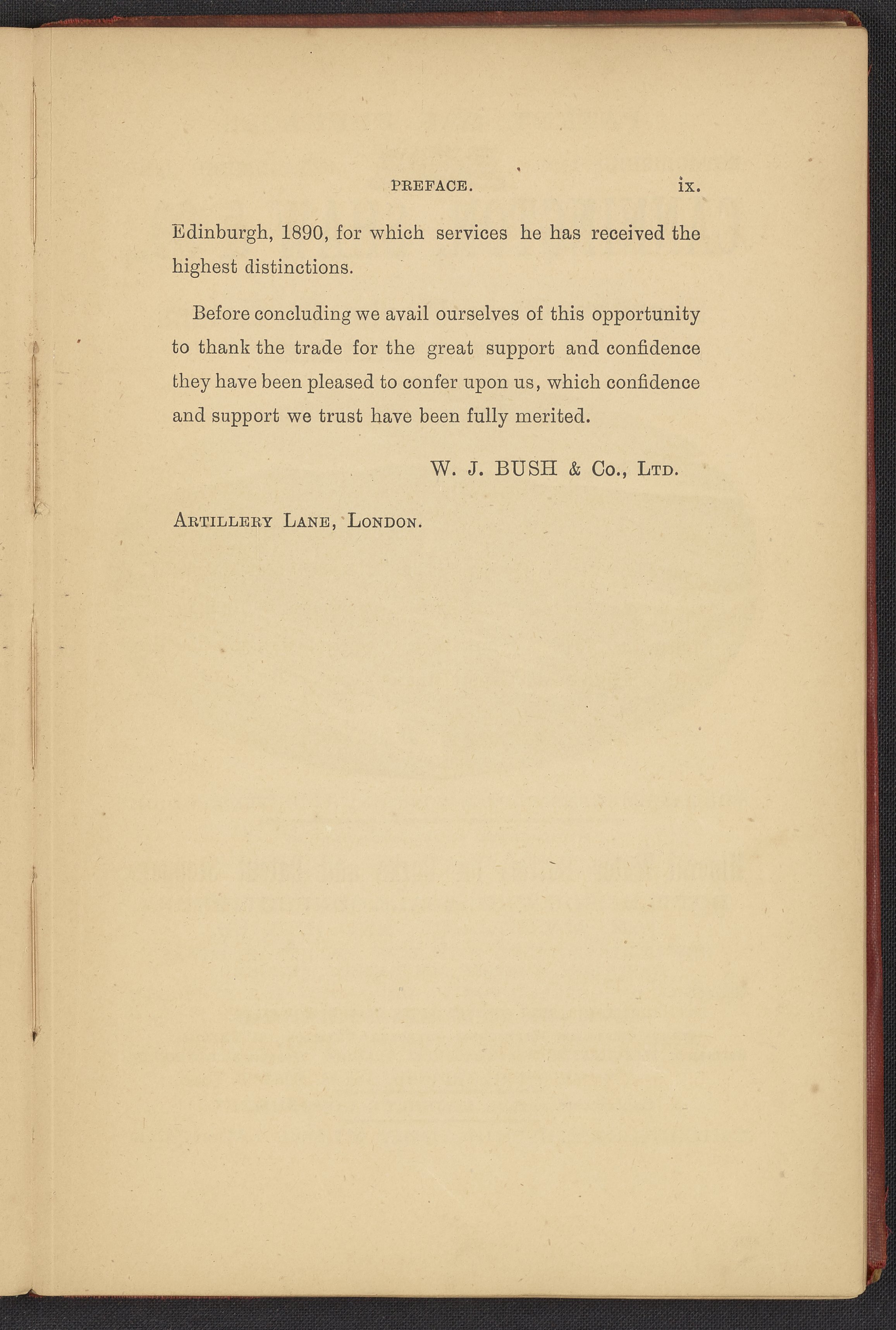 Small JPG1200 x 1749px — 527 KBFull-sized JPG2392 x 3486px — 1.8 MBOriginal fileTIFF — 2392 x 3486px — 23.9 MBWork containing a series of recipes for a variety of non-alcoholic beverages including aerated and mineral waters, dry fruit sodas, and non-excisable cordials using W. J. Bush & Co. brand flavors and syrups. W. J. Bush & Co., Ltd. was founded by William John Bush (-1889) circa 1851. The company is credited with being England's first maker of flavorings and essences. Bush's son, and author of this work, William Ernest, Baron de Bush, became head of the firm in 1889.