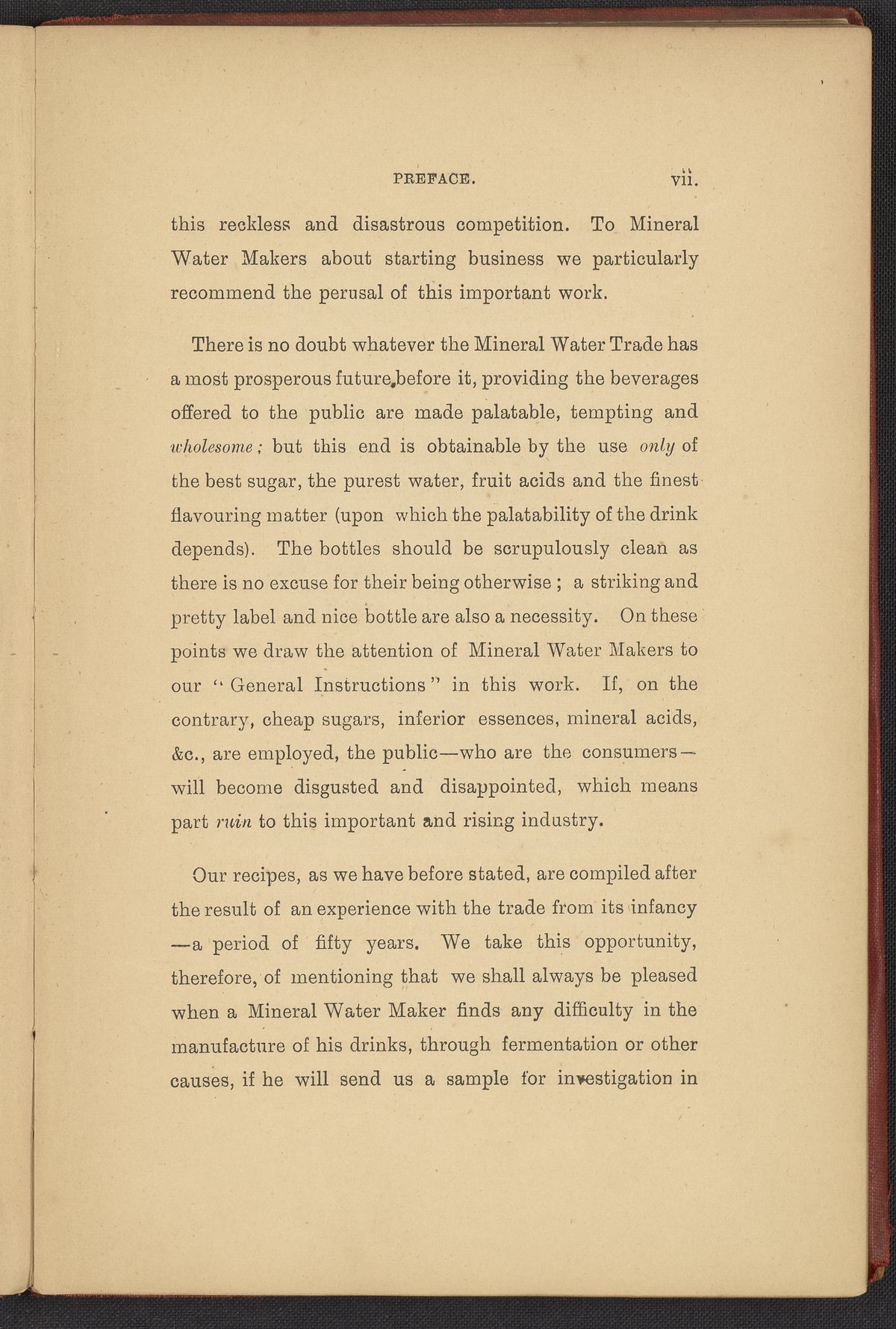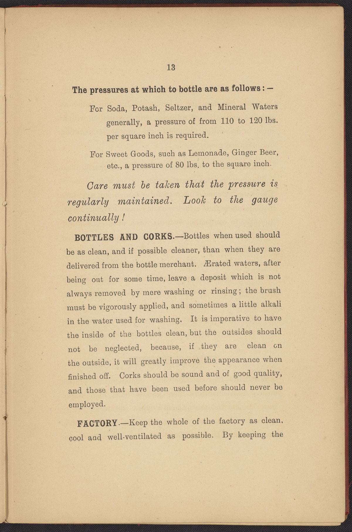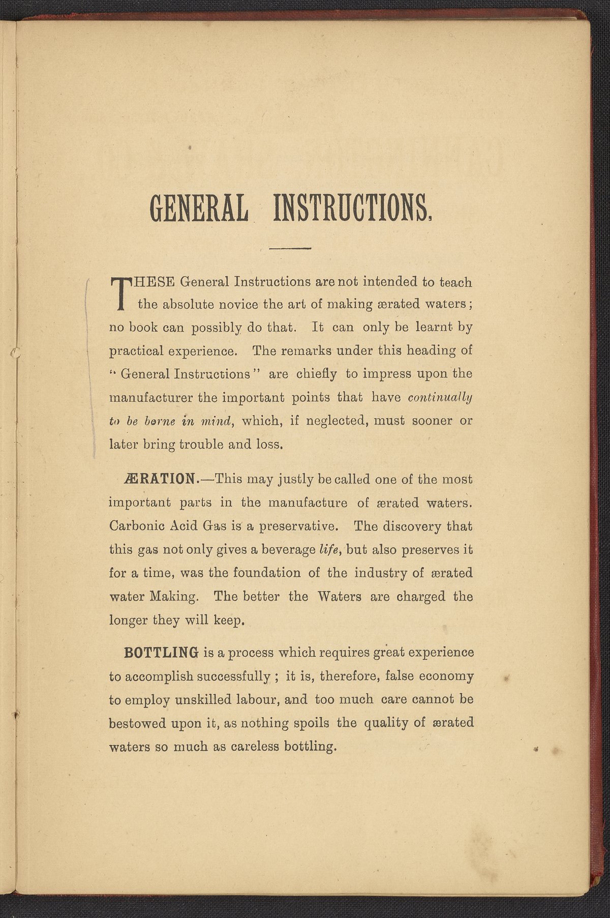 Written in response to the increasing public favor towards non-alcoholic and light refreshing beverages of the period, the work begins by providing general instructions for the mineral water manufacturer, placing an emphasis on cleanliness and high-quality ingredients. Then, the work contains numerous recipes for beverages such as "Cherryade," "Hop Bitters (Aerated)," "Dry Pineapple Soda," and "Quinine Tonic." Includes advertisements for materials applicable to the Mineral Water Trade.