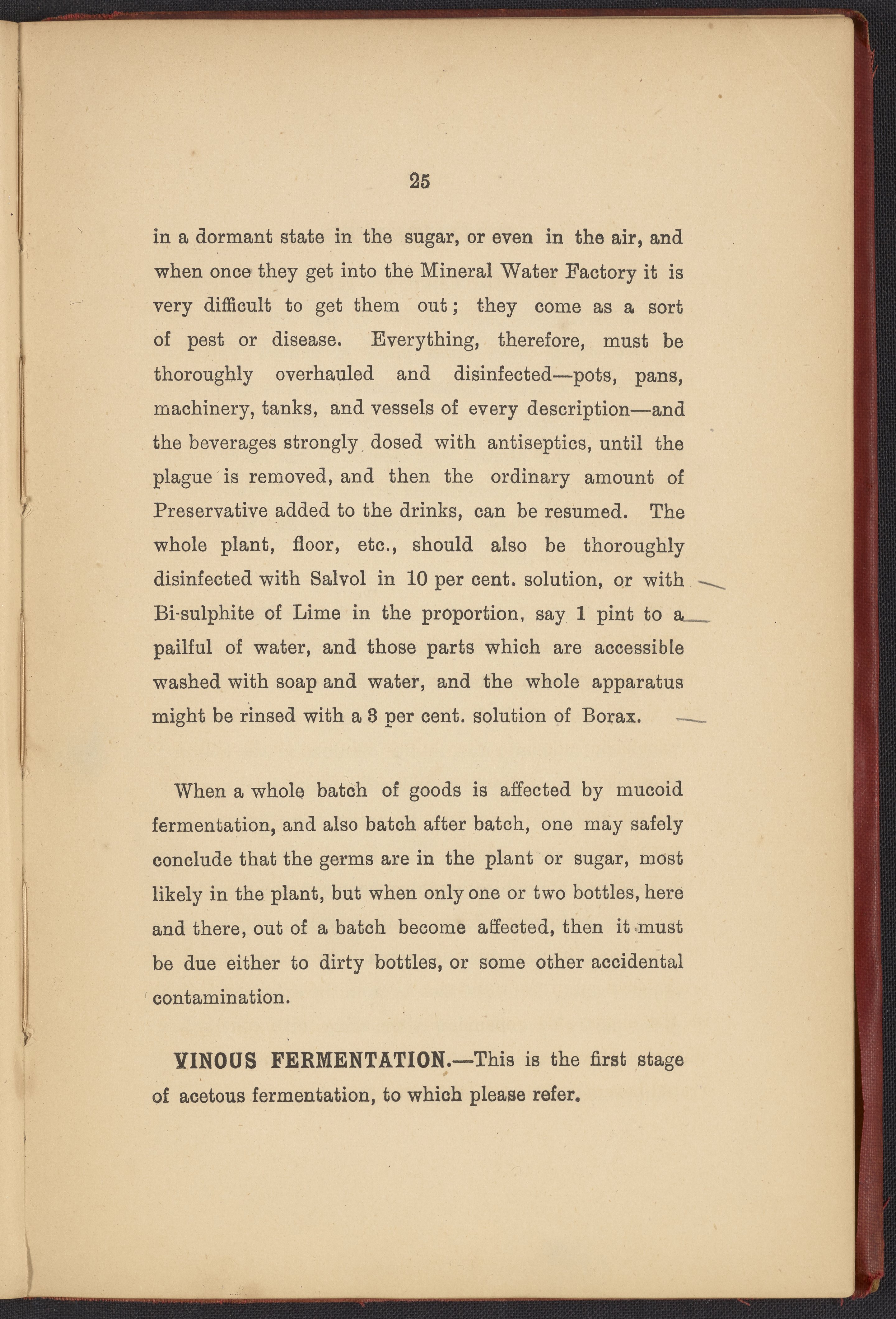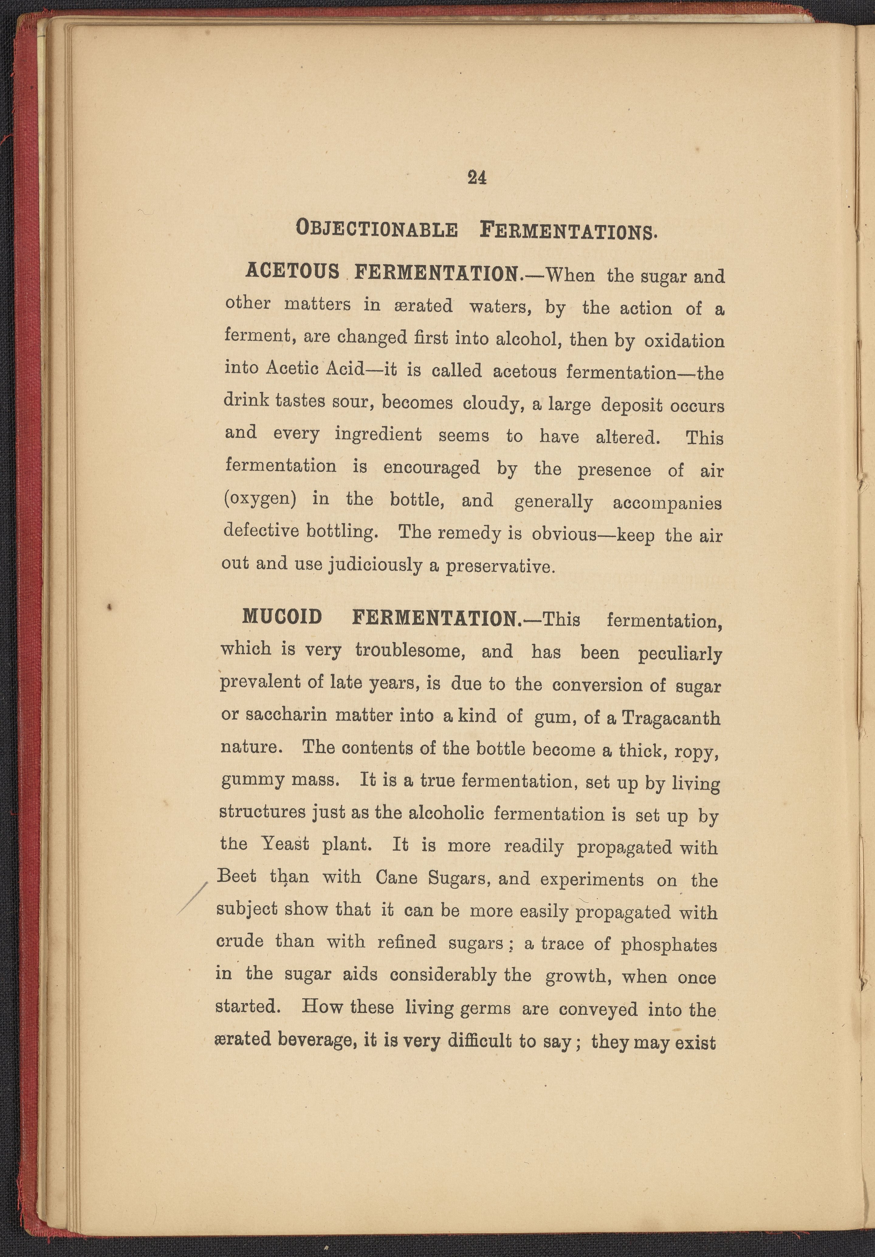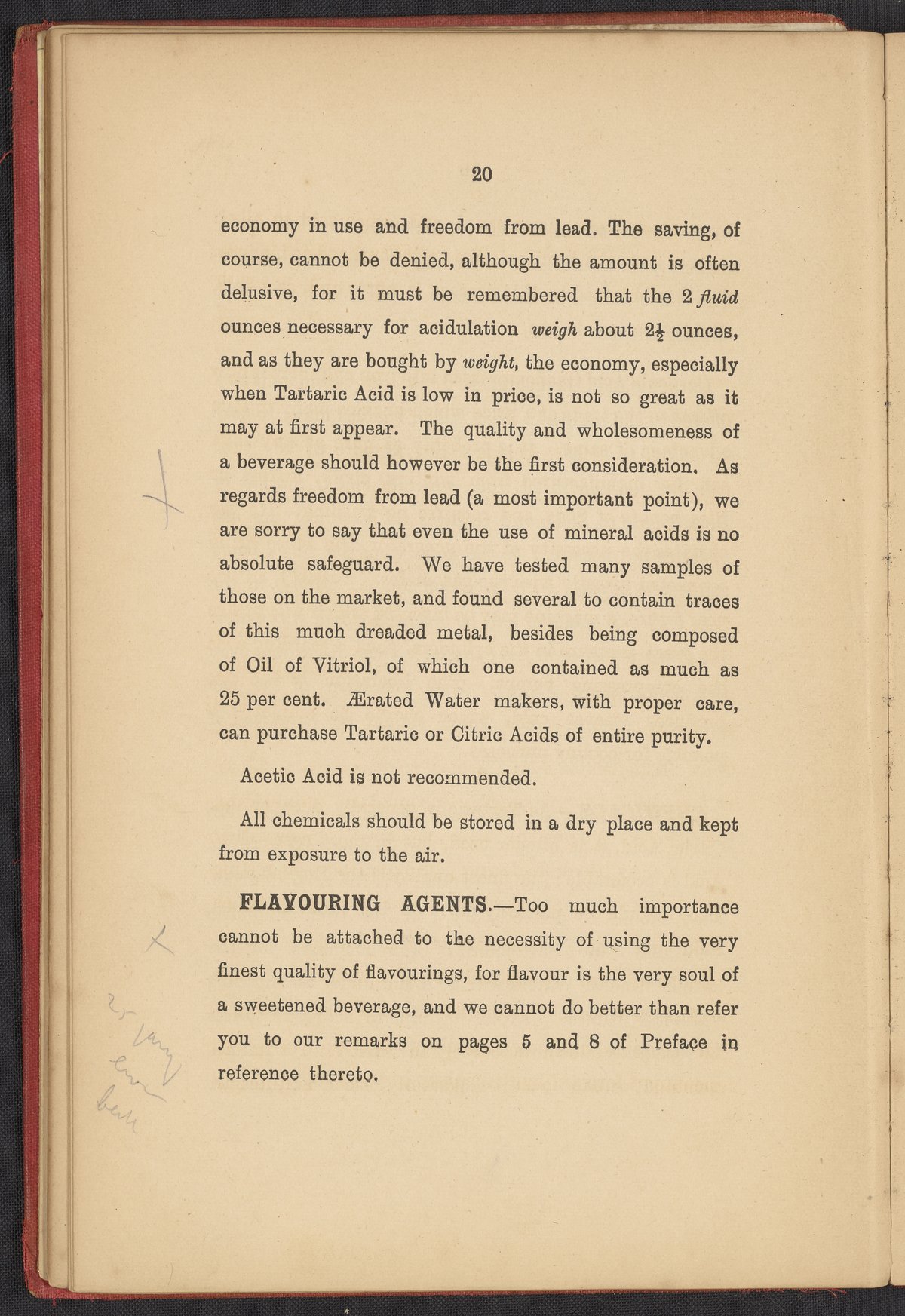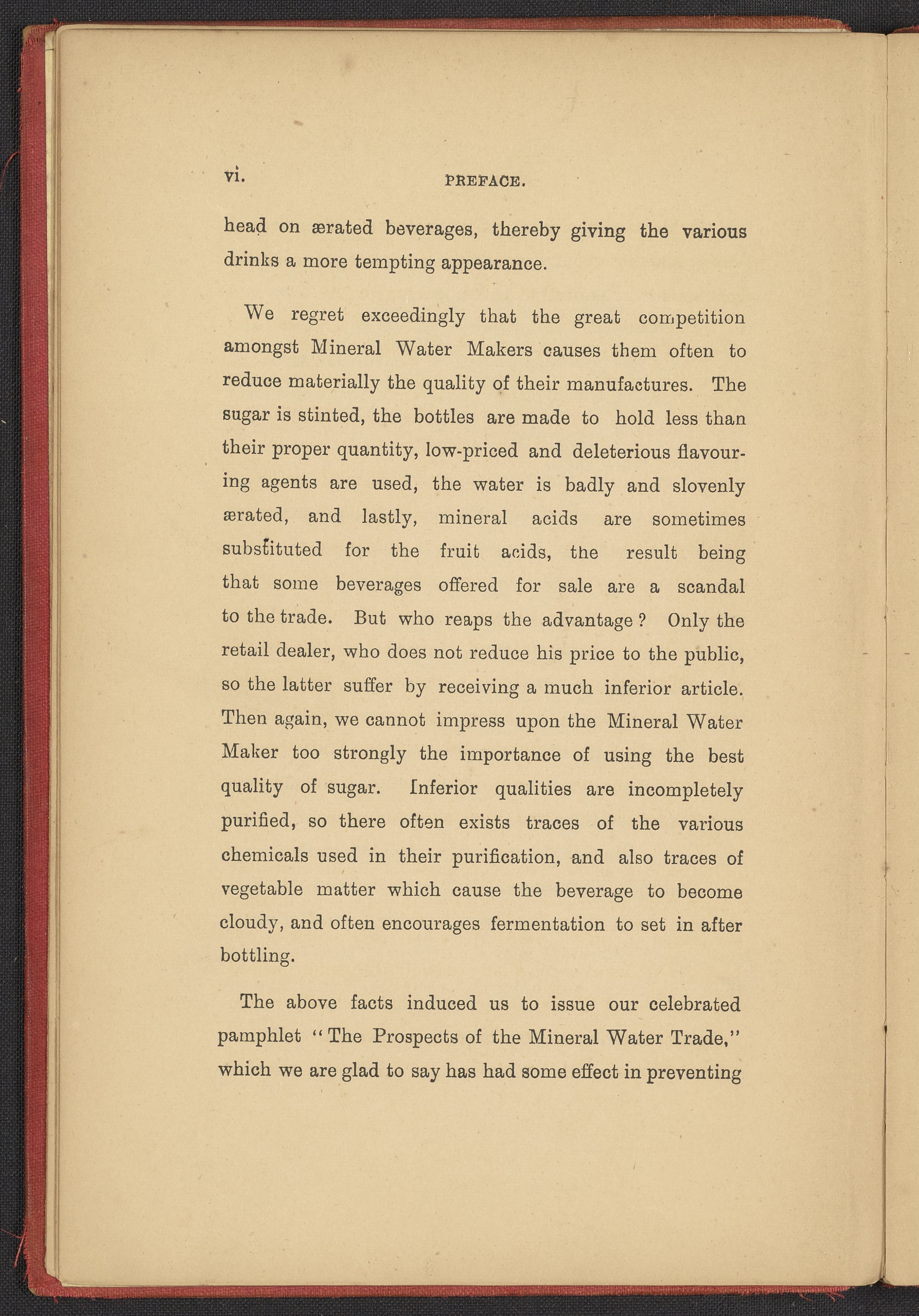 Written in response to the increasing public favor towards non-alcoholic and light refreshing beverages of the period, the work begins by providing general instructions for the mineral water manufacturer, placing an emphasis on cleanliness and high-quality ingredients. Then, the work contains numerous recipes for beverages such as "Cherryade," "Hop Bitters (Aerated)," "Dry Pineapple Soda," and "Quinine Tonic." Includes advertisements for materials applicable to the Mineral Water Trade.